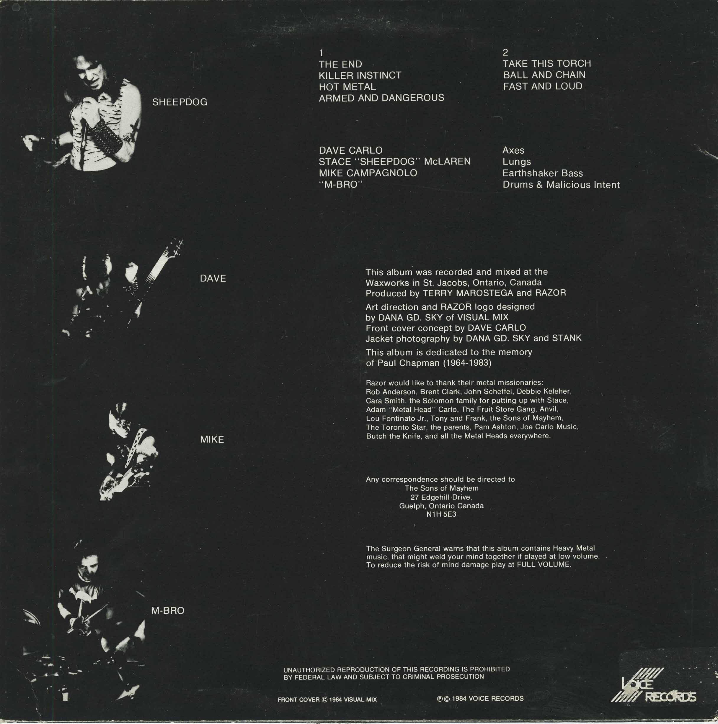 The vision began with four young men from Guelph, Ontario: Dave Carlo on guitar; Stace "Sheepdog" McLaren on vocals; Mike Campagnolo on bass; and Mike "M-Bro" Embro on drums. All of them fans of the then-new resurgence of heavy metal, they became hungry to inject the genre with a bleaker view of the world and its inhabitants: in essence, a cold, calculated assault in both melody and lyrical imagery. Their first outpouring of energy manifested itself as "Armed and Dangerous", a self-financed seven-song EP that would garner them underground acclaim via the 1200 copies pressed, and countless tape trading. This was all that was needed to secure a recording contract with Canada's Attic Records, with whom Razor would record their next three albums.