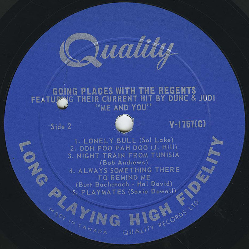Groschel developed some health problems that lasted about six months, which resulted in his being replaced by drummer Bob Andrews. Around 1963, The Regents broke up, but not for long. Reinvented as a recording band brought them wider fame and fortune. The lineup then was made up of Bob Andrews (trumpet), Russ Strathdee (sax), Judi Jantzen (vocal), Duncan White (vocal), Brian White (organ), Jack Arseneault (guitar), Wayne Harmon (drums) and Bruce Staubitz (bass). Bruce Staubitz: "The Regents recordings of four 45 r.p.m. singles (including two fine instrumentals, Night Train From Tunisia and Space Walk) and one album were done in 1964-65. They were all recorded at Hallmark Studios in Toronto. "One lukewarm hit emerged out of this recording phase, Me And You, issued by Quality Records in Canada and Blue Cat in the U.S. The Blue Cat release (label was a branch of Leiber-Stoller-Goldner owned Red Bird Records) was slightly messed up with by the implementation of added overdubs, although not glaringly evident. Bruce Staubitz: "By 1966, The Regents became a road band, as Dunc And Judi And The Regents, with some further personnel changes. "Thus the third and final phase of The Regents played out; another important Canadian band from the musically enriched 1960s.
