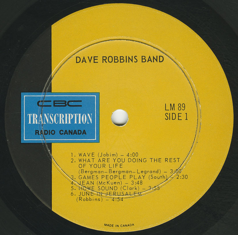 As Robbins’ CBC projects grew in scope, he moved toward full big-band recordings. In 1967 his orchestra backed singer Miles Ramsay on CBC LM-34, balancing popular repertoire with jazz charts, while in 1970 he led The Dave Robbins Band (CBC LM-89), which included his signature piece “Ripple Rock” alongside contemporary selections. These CBC projects, issued in limited runs for broadcast and educational use, are now seen as essential documents of West Coast Canadian jazz. They not only chart Robbins’ progression from small-group experimentation to ambitious big-band modernism, but also demonstrate his role as a unifying force among Vancouver’s finest musicians.