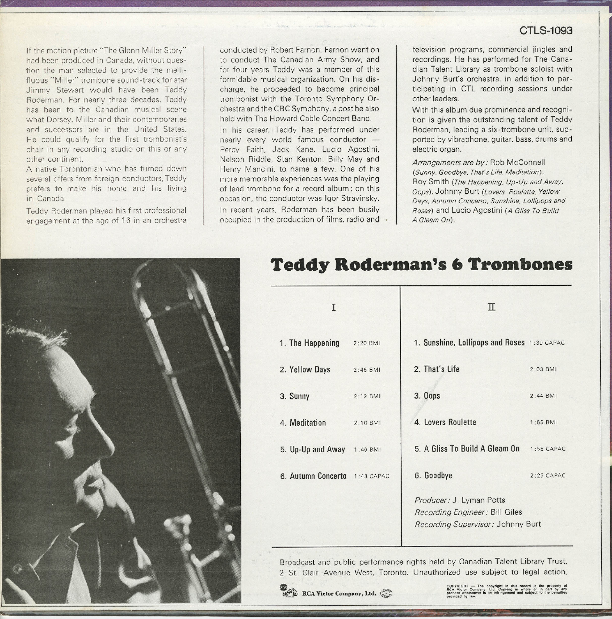 In 1967, Roderman stepped forward as a leader with Teddy Roderman’s 6 Trombones, a concept album featuring overdubbed trombone harmonies and chamber-jazz arrangements aimed at Canadian radio listeners. The LP included standout arrangements by Rob McConnell (“Sunny,” “Goodbye,” “That’s Life,” “Meditation”), Roy Smith (“The Happening,” “Up-Up and Away,” “Oops”), Johnny Burt (“Lovers Roulette,” “Sunshine, Lollipops and Roses”), and Lucio Agostini (“A Gliss to Build a Gleam On”).