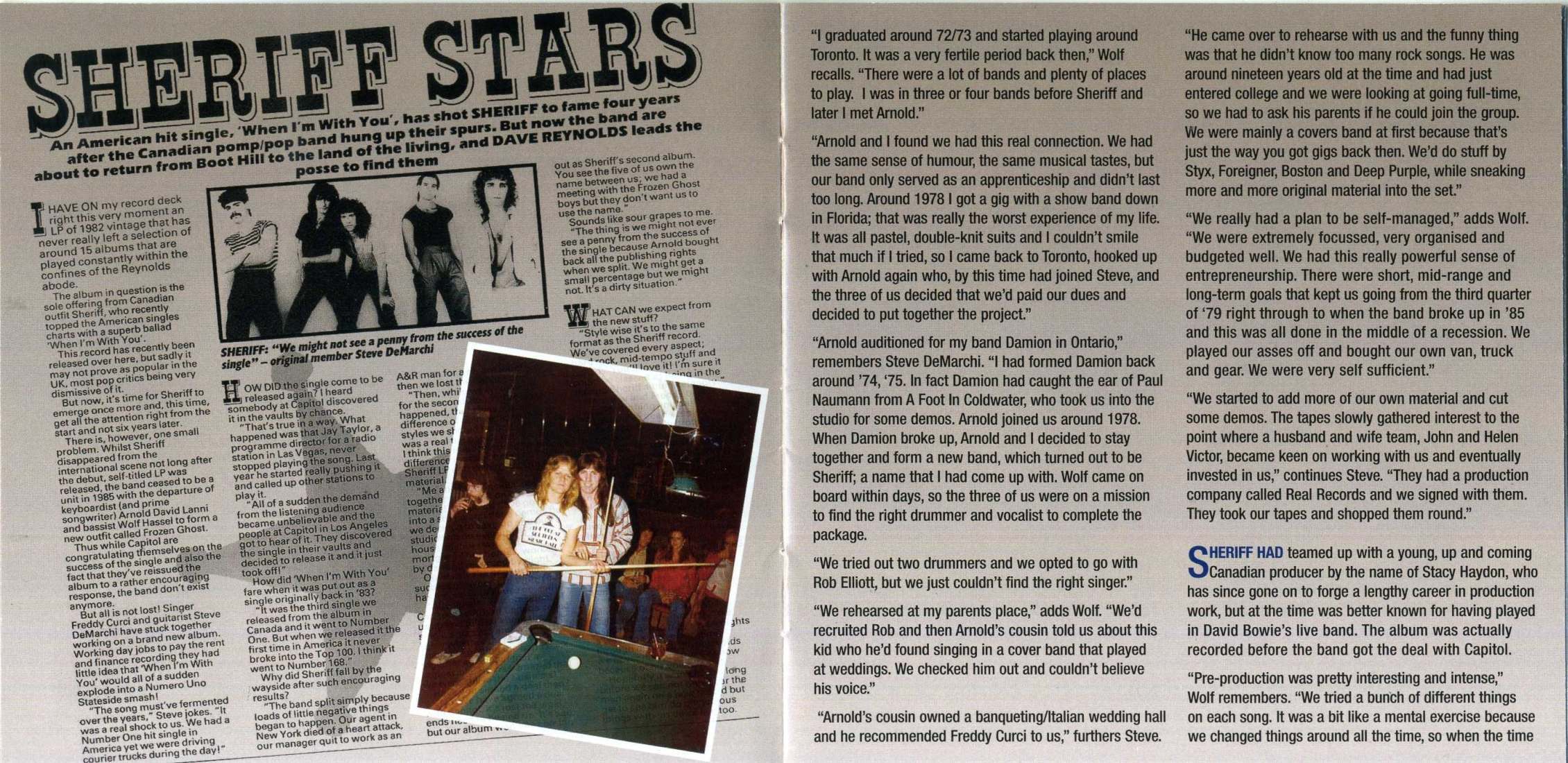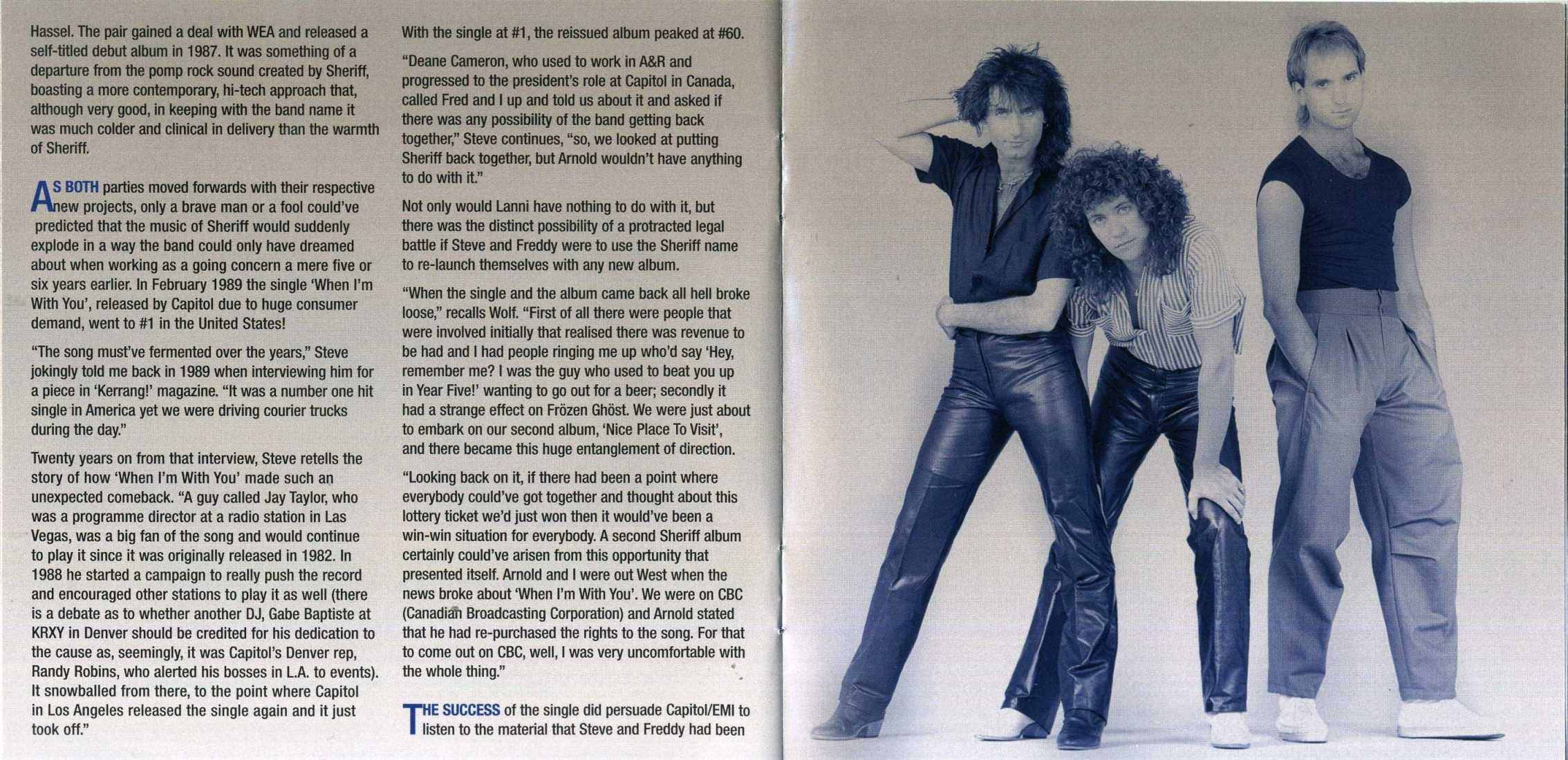 Sheriff finally signed with Capitol Records in 1983, four years after forming in Toronto. Though the band released only one album, a self-titled LP in 1983, their single "When I'm with You" reached number one six years after it was released. Vocalist Freddy Curci, guitarist Steve De Marchi, bassist Wolf Hassel, drummer Rob Elliott and keyboard player Arnold Lanni were pressured to re-form, but they declined since Lanni and Hassel had formed Frozen Ghost while Curci and De Marchi organized Alias.