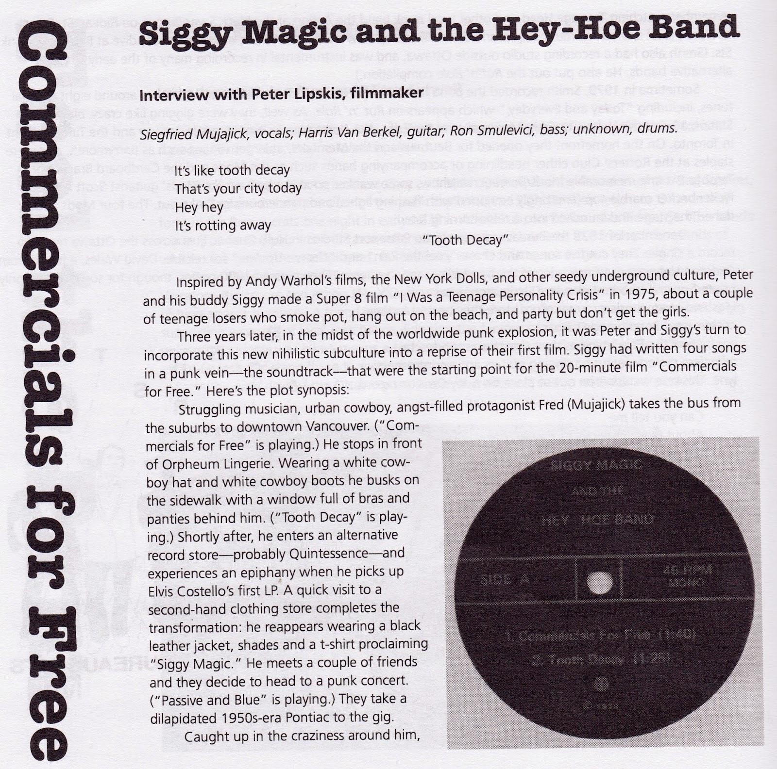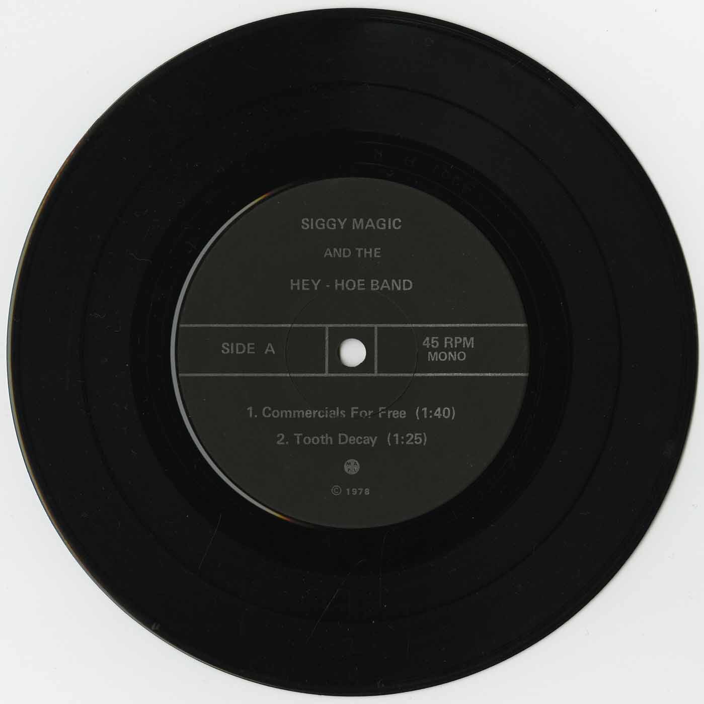 "Siggy Magic and the Hey-Hoe Band - Commercials for Free EP (Own, 1978). A country whose contributions to the punk vernacular rarely extend beyond tepid pop excursions or the substandard aping of their southerly neighbors. Now, now, before any Canadian aficionados feel unduly provoked and start spouting lines like “Hasn’t this asshole ever heard of the Neos, Dayglo Abortions, DOA, etc.?” let me lazily post the following disclaimer: The snare above is only in reference to the real never-weres—those bands or individuals whose records were pressed in the low hundreds and whose aspirations extended no further than their own vanity. It’s not my intention to undermine or denigrate this record’s musical superiority through qualifiers, but the reality that the UGLY sounds of the Hey-Hoe Band originate from the bucolic expanse of the Great White North is a decisive part of what makes the disc so remarkable. The fact that it’s a signature slab of strangulated roar / fortified grunt and strut, paralleled only by its closest philosophical compatriot—the first Snuky Tate EP—is of equal importance, too! The Commercials for Free EP, its tracks the proverbial lead-pipe cinch for inclusion on KBD #9 or #10, ended up on the last installment of Smash the State instead and was effectively lost to a wider audience. In a better world, this 45’s reputation would linger on the trembling lips of record collecting mama’s boys and forum trolls the world over. Not surprisingly, both Siggy and his EP were concepts that hatched and expired within the confines of the studio. The single, issued in an edition of 200 copies, features four songs; each tune corresponding to a specific act within a film of the same name. Chronicling the sojourn from yokel to punker, the record’s only dud, The People Who Cheated Me, was intended for the film’s denouement and expressed Siggy’s ultimate disenchantment with his newfound lifestyle. Poor Siggy."