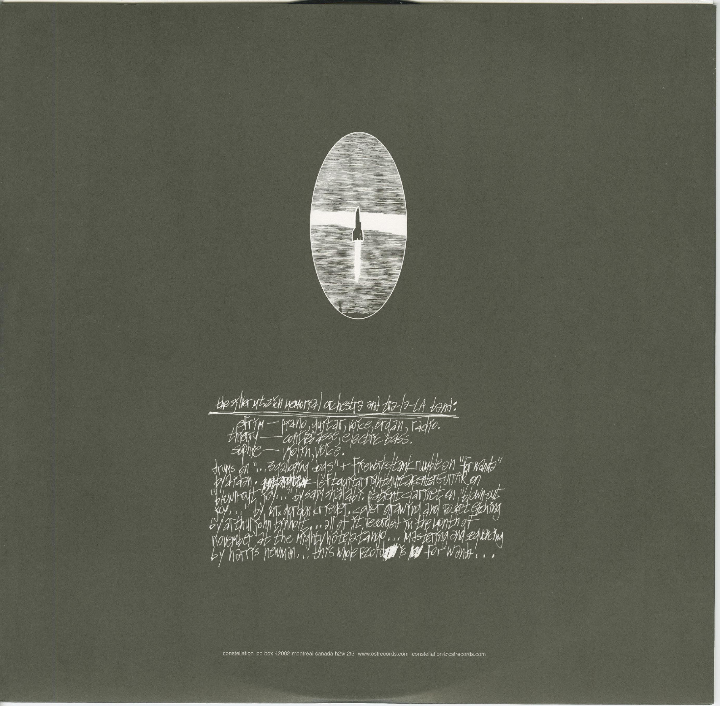 A Silver Mt. Zion was formed by Efrim, Thierry and Sophie (all of GY!BE) at the beginning of 1999, and after a debut performance at Constellation's Musique Fragile concert series, the trio recorded this sublime debut record on 8-track at the Hotel2Tango in November of that year. Starting with simple, stirring piano themes written by Efrim, the music swirls and sways with multiple violin tracks from Sophie and plucked contrebasse from Thierry (his first recording on upright acoustic bass). What initially began as a single long, sparse chamber piece evolved into more fully-orchestrated movements, interspersed with tapes, drones and loops, along with some vocals. Guest musicians include Aidan (GY!BE, Exhaust, 1-Speed Bike) beating skins on "Sit In The Middle Of Three Galloping Dogs", and Gordon Krieger (Exhaust) and Sam Shalabi (The Shalabli Effect, solo) improvising on clarinet and electric guitar respectively on "Blown-Out Joy From Heaven's Mercied Hole". Additional taped fragments are from Efrim's archives, with contributions from Aidan. The resulting series of plaintive ensemble pieces shivers with intimate sadness. He Has Left Us Alone… is by far our most requested record for student film projects. Dedicated to Efrim's dog Wanda, who was dying of cancer while the album was made.