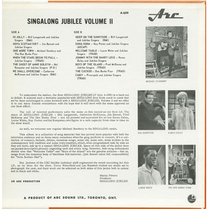 To understate the matter, the first SINGALONG JUBILEE LP (Arc A-608) is a hard act to follow. It enjoyed such a fantastic popularity with SINGALONG fans from coast to coast that we’ve been encouraged to come forward with a SINGALONG JUBILEE, Volume 2 and we offer it to our many friends everywhere with the hope that it will meet with the same approval as our first effort.
