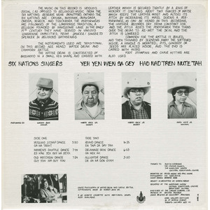 The music on this record is Iroquois social (as opposed to religious) music from the Six Nations reserve near Brantford, Ontario. The Six Nations are: Cayuga, Mohawk, Onandaga, Oneida, Seneca, and Tuscarora. The performers are followers of the longhouse tradition, a religion founded by Handsome Lake in the early 19th century. They have served in various longhouse capacities, from dancer/singer to speaker in religious gatherings.