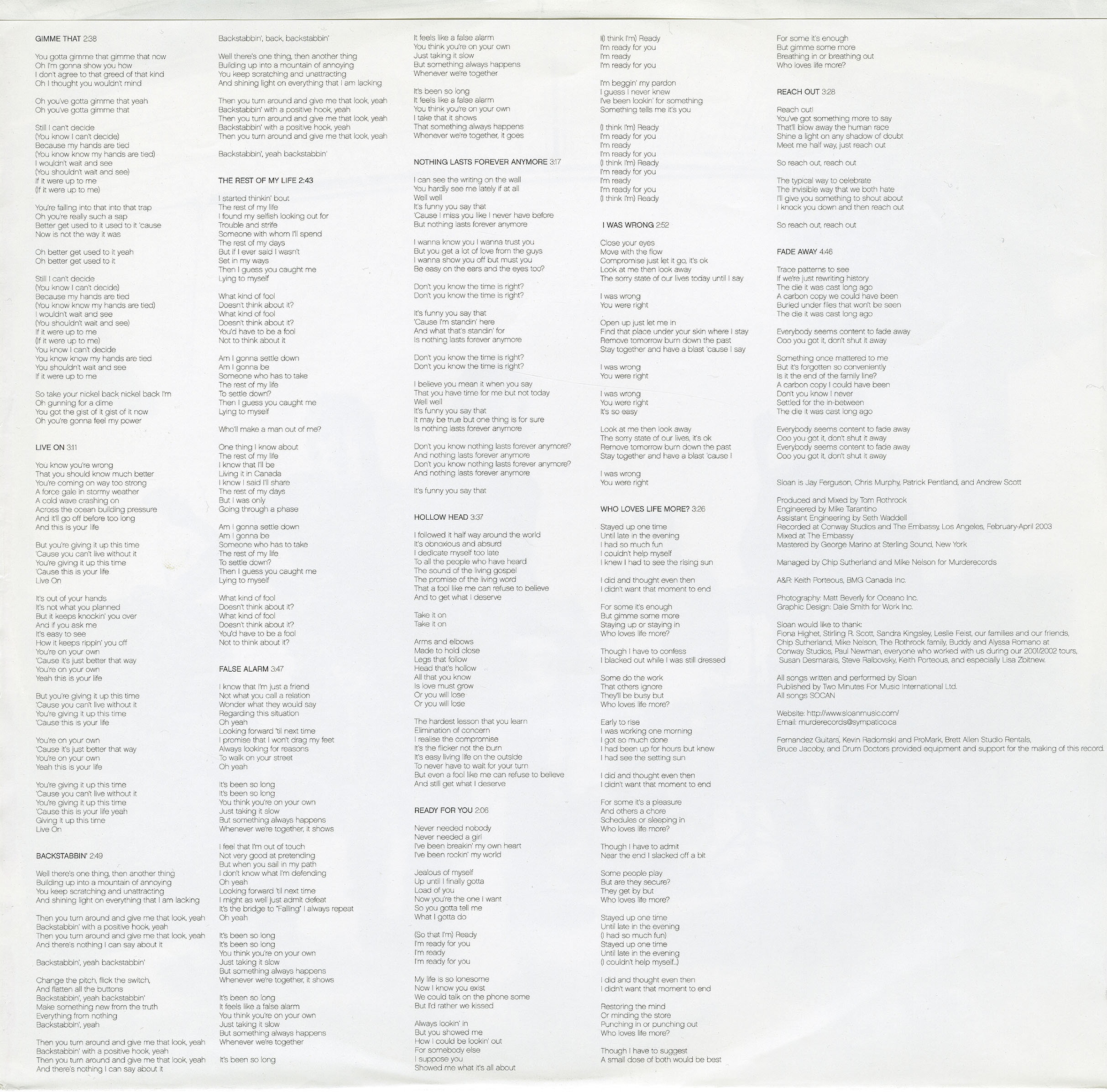 Sloan have been conquering power pop for over a decade now with an incalculable and possibly illicit debt to every great glam, punk, and hard rock band of the 1970s. The songs are irreproachably written and rhapsodically performed, and yet they remain incarcerated within the shackles of influence. It's not even as clear-cut as a derivative band churning out songs not up to par with the icons they emulate; on past albums, Sloan has written better songs than anything The Rolling Stones have put out in 20 years. It's nothing more nor less than comfort food: virile riffs, clunking drums, four-part harmonies, and disparate songs with lyrics that range from the exhaustive task of getting a girl to love you to the exhaustive task of getting a girl to love you for a slightly longer period of time. As anyone who's ever lived through a reality I like to call "perpetual pain and torture" knows, comfort food is often valuable, even necessary.