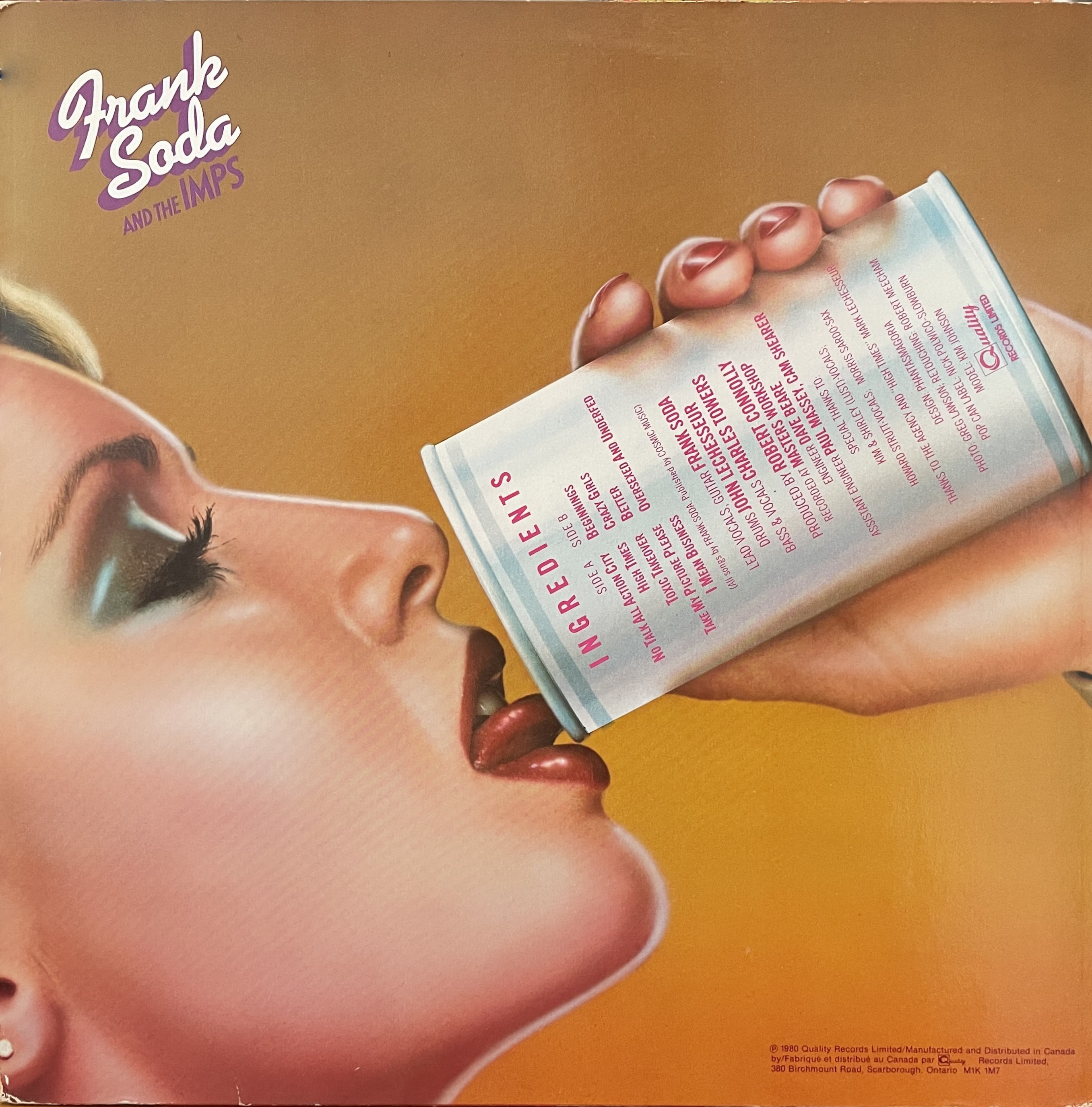 Frank Soda & The Imps released Soda Pop in 1980. "Take My Picture Please" made it as a single as well as 7" single, as did "Oversexed and Underfed." Other notable tracks included "Crazy Girls" and "Toxic Takeover." The band toured constantly, including opening for the likes of The Stampeders, and this album played a big part in the energy and excitement of their live shows.