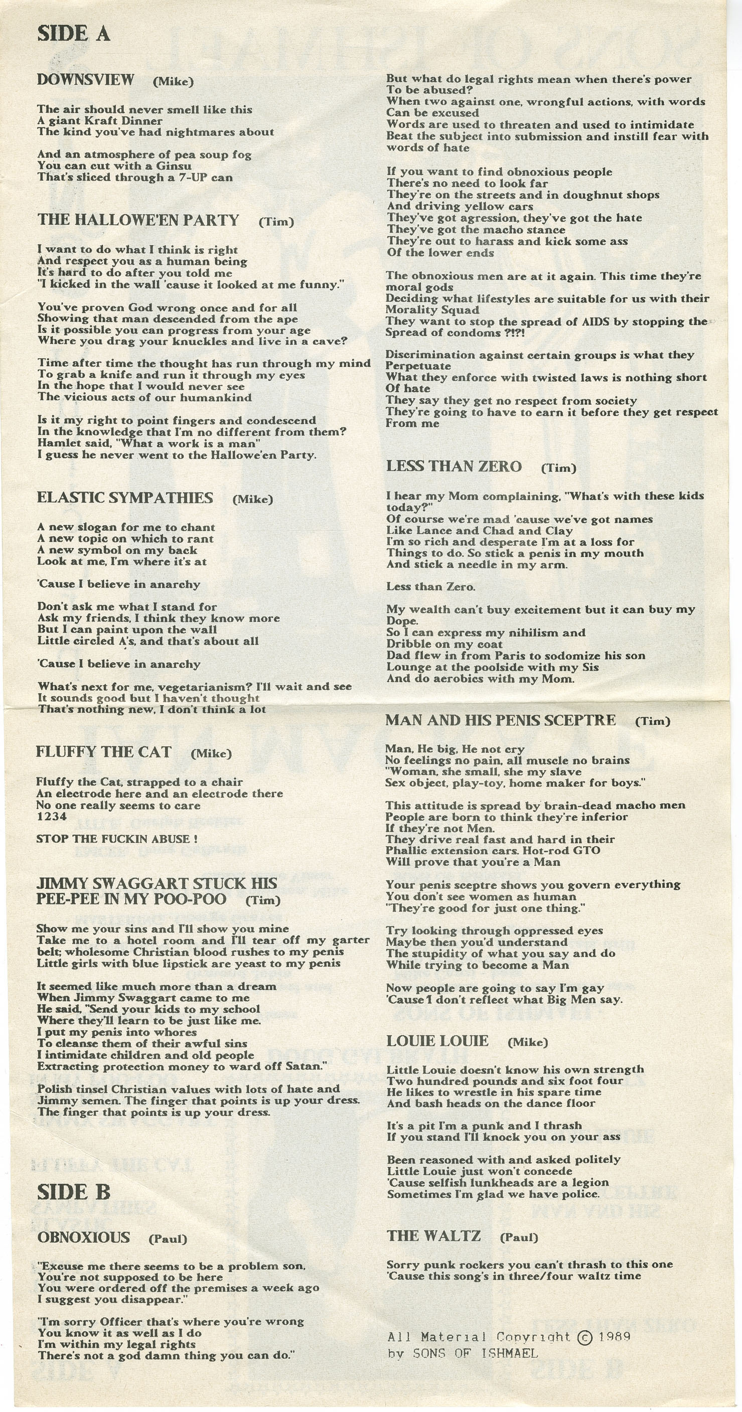 From the outset, Sons Of Ishmael were driven less by technical polish than by speed, density, and lyrical specificity. Influenced by American hardcore acts such as Jerry’s Kids, MDC, Crucifix, and early SST Records bands—including Black Flag, Hüsker Dü, Minutemen, Meat Puppets, and Saccharine Trust—the group combined blunt aggression with sarcasm, social critique, and a distinctly Canadian sense of humour. Their songs often skewered authority, conformity, and macho posturing, while also reflecting the frustrations of growing up punk in a town largely indifferent or hostile to the subculture.