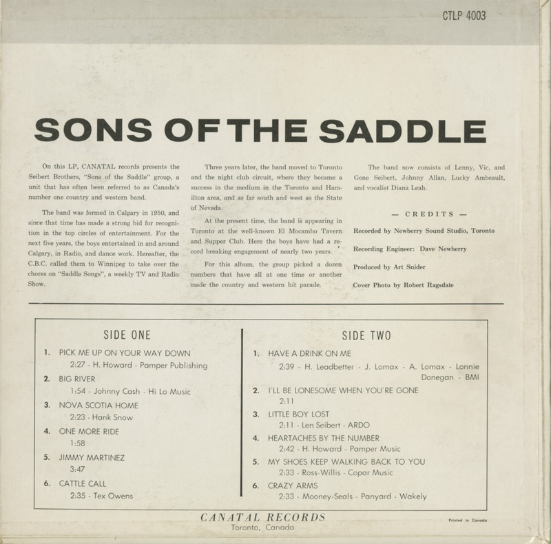 On this LP, Canatal Records presents the Siebert Brothers, “Sons of the Saddle” group, a unit that has often been referred to as Canada’s number one country and western band.