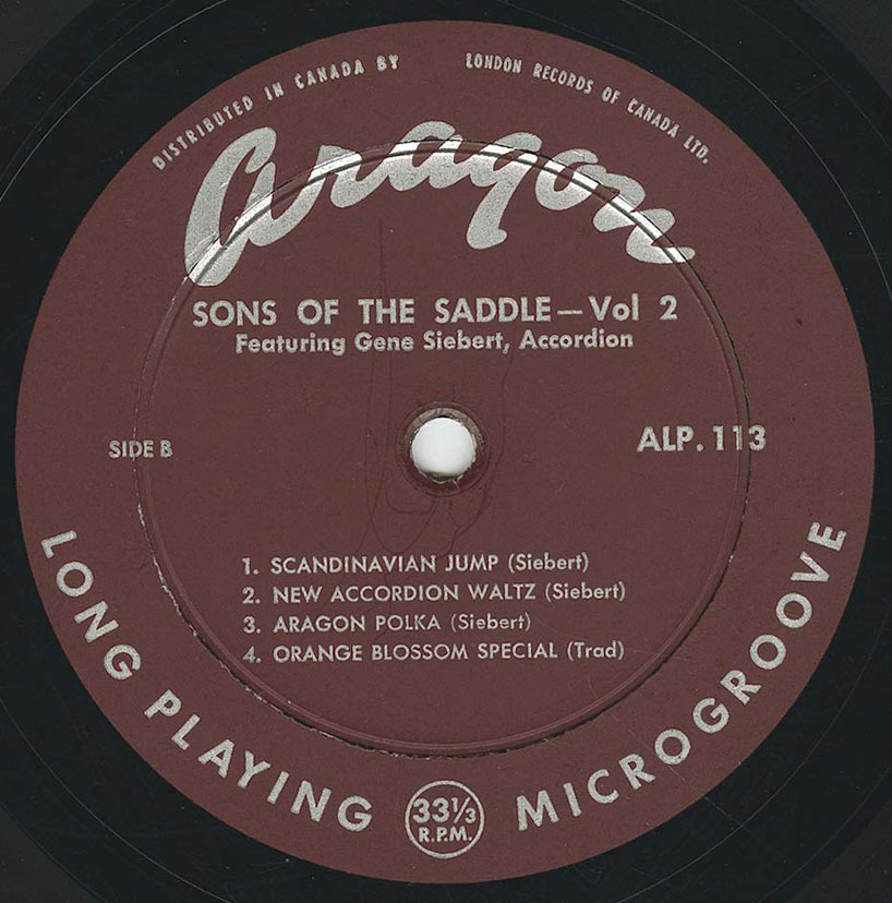 The group’s recorded output consists of a small but significant run of Canadian LPs issued in 1959 and the early 1960s. Two albums were released on Aragon Records—Sons of the Saddle Vol. 1 Featuring Vic and Lenny Siebert (ALP 108) and Sons of the Saddle Vol. 2 Featuring Gene Siebert (ALP 113)—documenting different Siebert-led configurations of the band. A later self-titled LP on Canatal Records (CTLP 4003) presented a repertoire drawn largely from contemporary country standards alongside original material associated with the group.