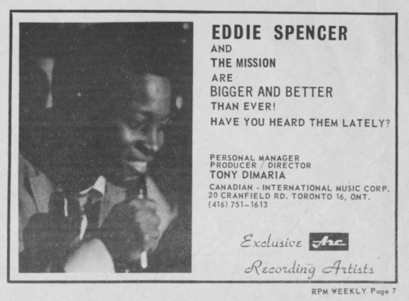 By mid-1967, Spencer was fronting the R&B band The Power, delivering sweat-drenched sets and commanding midnight floor shows with what RPM Weekly described as a “tough-as-nails delivery.” Inspired by Jimi Hendrix and the new rock underground, Spencer formed a new group, Eddie Spencer and The Mission, fusing rock and soul with some of Toronto’s top musicians. The Mission was featured in the July 8, 1967 issue of RPM Weekly, which described Spencer as “a powerful solo act… with a style that ‘gets to’ his audience.”