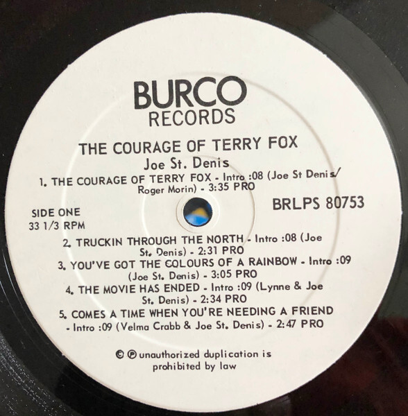 Joe St. Denis, of North Bay, Ontario - "The Courage of Terry Fox", released on Burco BRLP 80753.