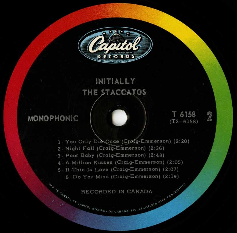Ottawa, Canada's favorite band of the 1960's-who later evolved into the Five Man Electrical Band. While most bands of the era were filling their albums with cover tunes, Songwriters Les Emmerson & Vern Craig were cranking out some great original thoughful provoking rock, pop and some with a touch of blues and gospel as well. Tracks like "It Must Be Love", It's A Long Way Home", Small Town Girl", "You Only Die Once", "Nightfall", "Do You Mind", "Move To California". Many of the tracks on the album became singles as well-that's how good they were. Some tracks featured pounding drums, drivin' bass and high pitched guitars, while others offered softer and melodic tunes - but all featuring the trademark Staccatos vocal harmonies-absolutely flawless. A much sought after album. This copy features the rare original thick matte cover and the original capitol inner sleeve.