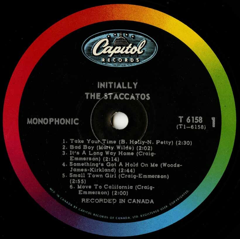 Before the Five Man Electrical Band, there was the Staccatos - the first sparks of a fantastic band with great vocals, and a great songwriter, Les Emmerson-then paired with with early Staccatos member Vern Craig-who wrote most of their tunes together with Les. After Signing with Capitol records, The Staccatos began to score many local successful singles in the Ottawa Area. "Small Town Girl, "Move To California", "It's A Long Way Home", "Poor Baby", "Do You Mind" - all of which are contained on this album, along with several other originals like "Nightfall", "Something's Got A Hold On Me", "If This Is Love". Along with covers like "Take Your Time" & "Bad Boy" Recorded in a very short period of time, the Staccatos managed to pull off a winner. With jangly guitars, uptempo rhythms and music to keep you moving. Certainly not your typical debut album from a 60's band. This album features the ultra rare first pressing high gloss laminated front cover. Dean Hagopian (vocals; 1963-64) Brian Rading (bass) Rick 'Bell' Belanger (drums) Les Emmerson (vocals, guitar) Vern Craig (guitar; 1963-68) Mike 'Bell' Belanger (2nd drums; 1968-73) Ted Gerow (keyboards; 1968-73)
