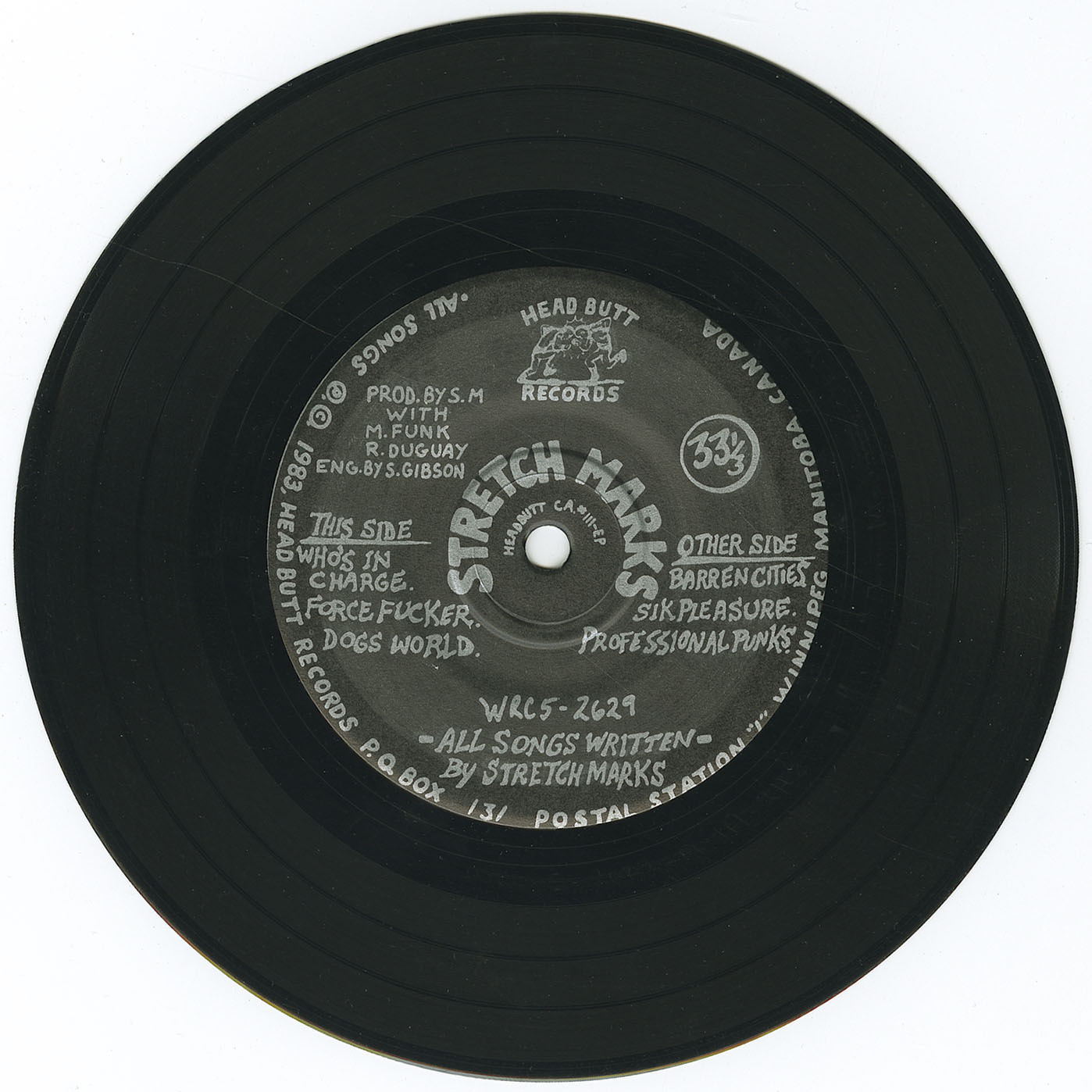 Determined to maintain control over their output, Stretch Marks formed their own imprint, Headbutt Records. Their debut EP, Who’s In Charge (1983), was self-financed, pressed in Toronto in small runs, and assembled by hand. Recorded with Mitch Funk and Richard Duguay involved in the production orbit—and engineered under difficult conditions by Scott Gibson—the EP captured the band at their most volatile: short, explosive songs attacking political hypocrisy, nuclear paranoia, and hollow rebellion. Tracks such as “Professional Punks,” “Dogs World,” and “Another Tragedy” became underground staples, while the EP’s rapid sell-through confirmed that Stretch Marks were operating at a level well beyond most of their peers.