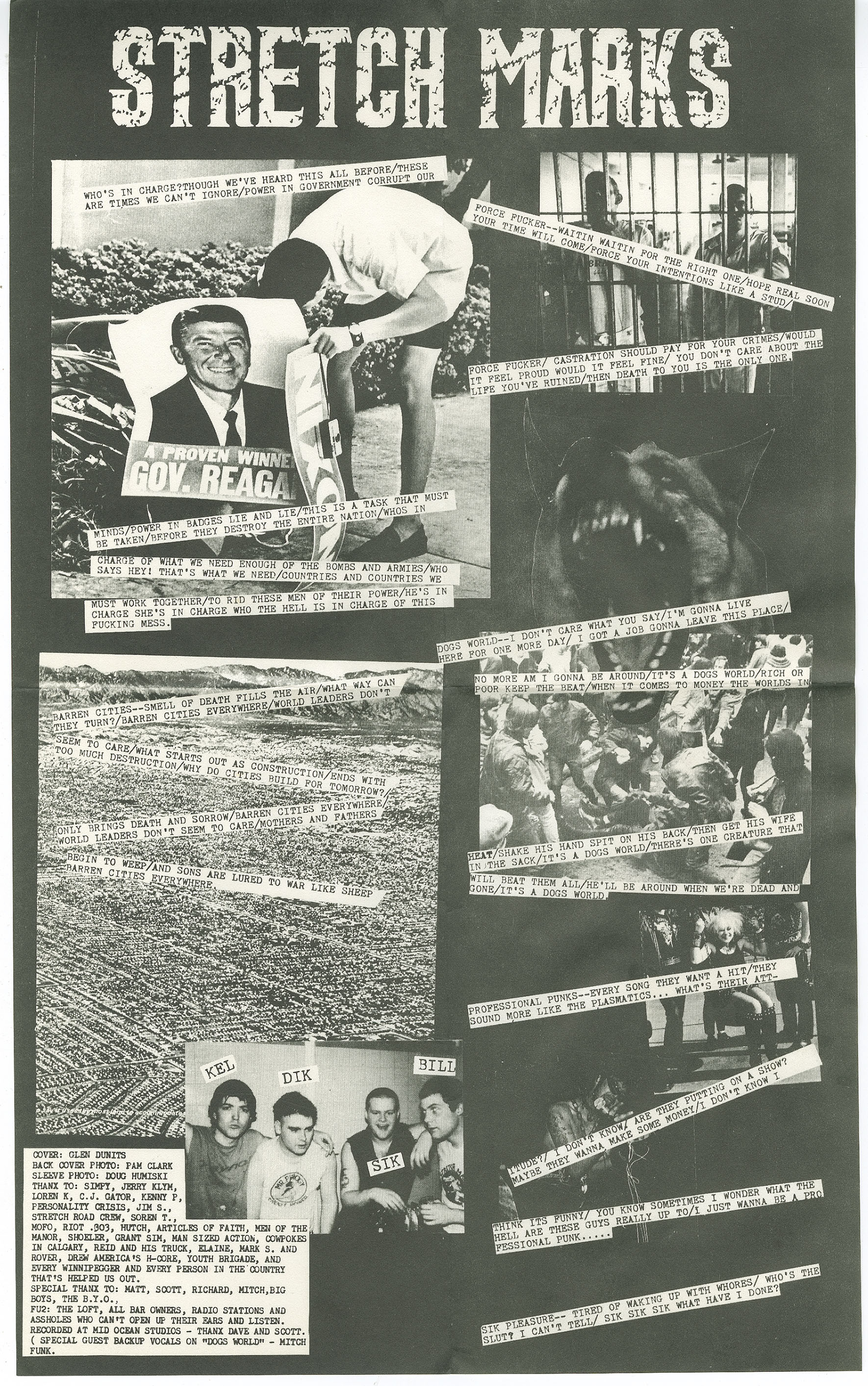The band began as a two-piece formed by brothers Bill and Kelly Jackson, writing fast, blunt songs before expanding into a full lineup with the addition of vocalist Dave McCombe (soon known as Dik Savage) and bassist Mark Langtry, who adopted a revolving cast of aliases including Sikbee, Sicby, Terror, and Mark Stretch. From the outset, Stretch Marks combined the velocity and austerity of early American hardcore with a distinctly Canadian sensibility shaped by Cold War anxiety, nuclear dread, and an intolerance for posturing—inside punk as much as outside it. Their music was confrontational, but never humourless; absurdity, satire, and self-awareness were integral to their identity.