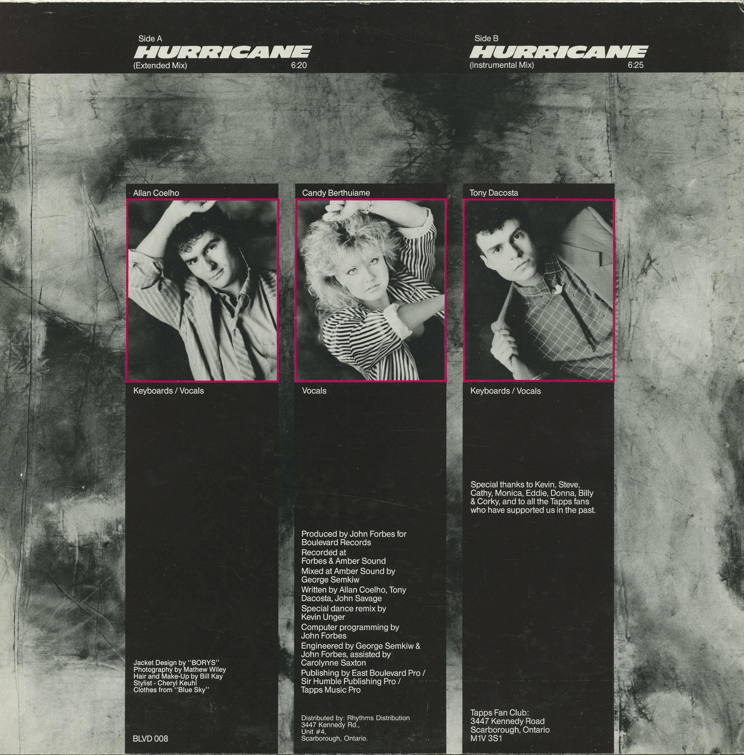The band’s most important phase began in 1985 when they entered the Boulevard Records orbit. Their first major Boulevard release, ‘Hurricane,’ marked a significant step forward in both presentation and ambition. Produced and computer-programmed by John Forbes, with engineering by George Semkiw and Forbes and vocals by Allan Coelho, Tony DaCosta and Candy Berthiaume, ‘Hurricane’ refined the Tapps sound into something cleaner, bigger and more overtly commercial without sacrificing club impact. It quickly became one of the group’s most enduring songs and was presented as a fully Canadian package, complete with MAPL symbols indicating 100% Canadian content.
