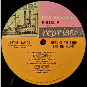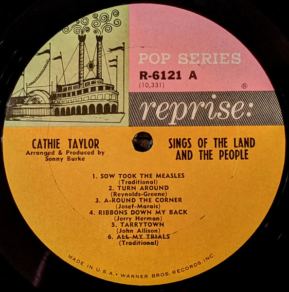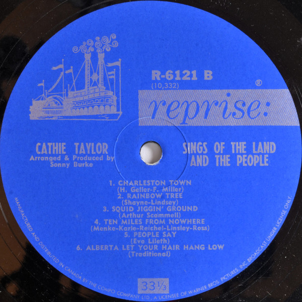 Cathie Taylor was a folk singer who was born in Winnipeg in 1944, Manitoba. Her family moved to California when she was a child. Her album, "Sings of the Land and The People" was her fourth album, and was released in 1964 on Reprise Records RS-6121. The tracks are: Sow Took the Measles/ Turn Around/ A-Round the Corner/ Ribbons Down My Back/ Tarrytown/ All My Trials // Charleston Town/ Rainbow Tree/ Squid Jiggin' Ground/ Ten Miles from Nowhere/ People Say/ Alberta Let Your Hair Hang Low.