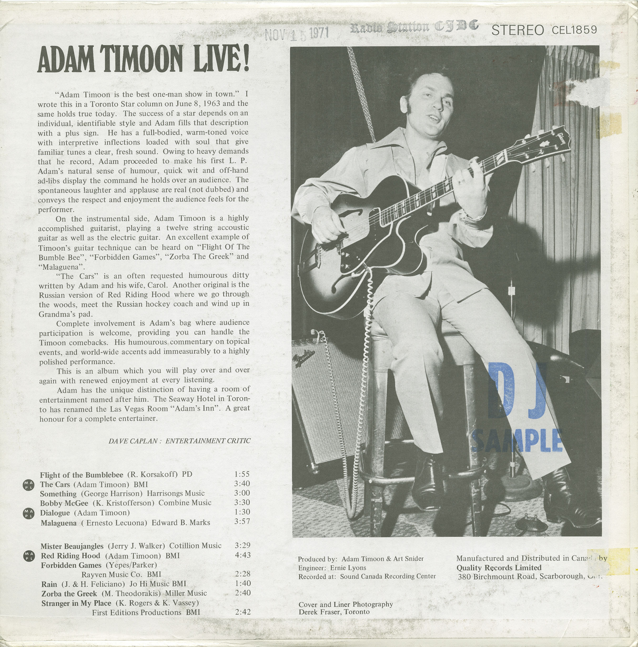 Adam Timoon is a nightclub entertainer whose act consists of equal parts music and comedy, but he's an extremely accomplished guitarist who can sing a lick, too. These days he plays retirement homes and corporate events, but way back when he was a regular on Cross Canada Hit Parade, and for many years he headlined the Seaway Hotel in Toronto, where the Las Vegas Room was renamed "Adam's Inn". That's about all I have in terms of biographical information on Timoon, although I can add that he was married to a woman named Carol who co-wrote some of his songs.