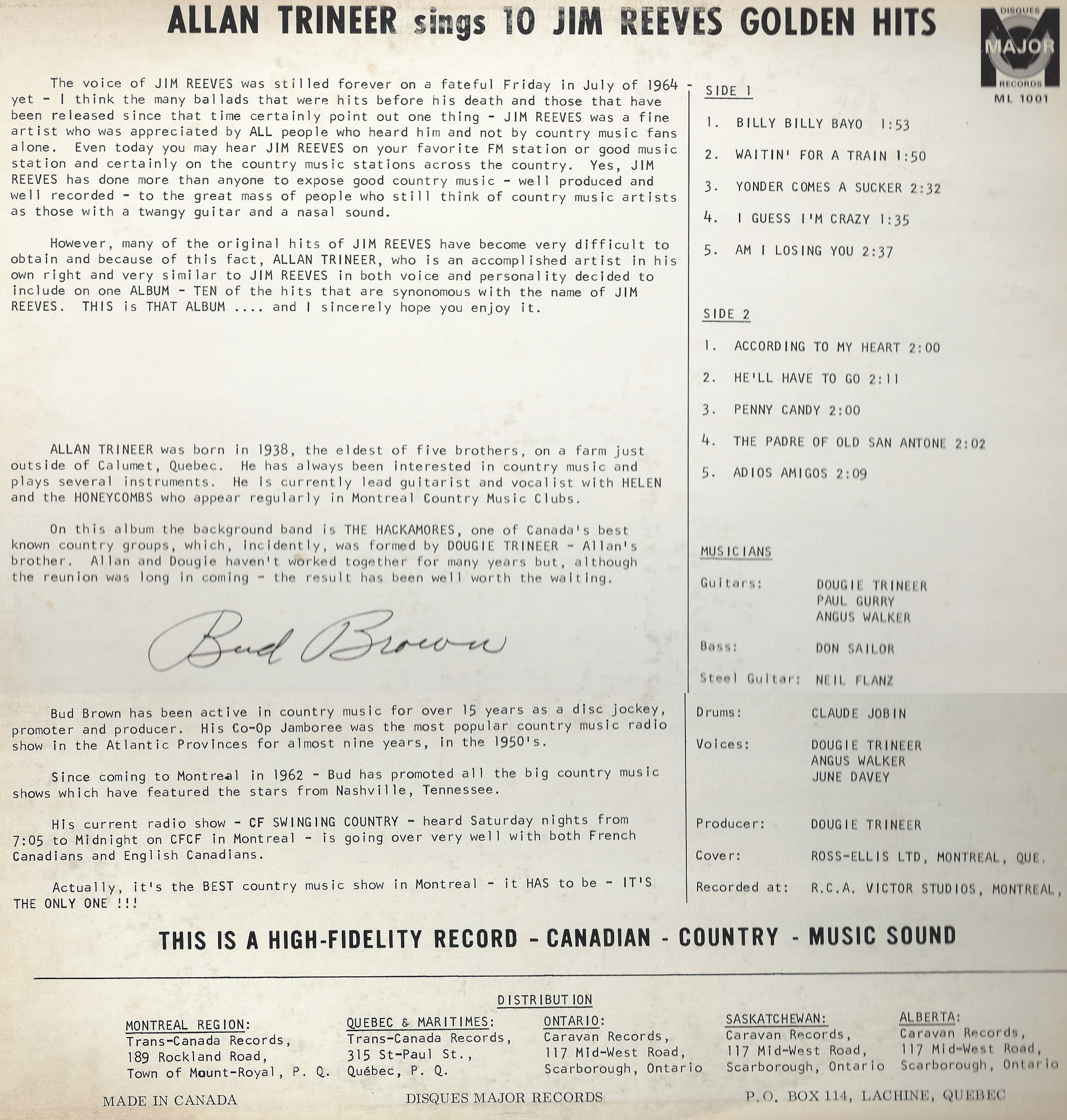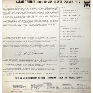 On this album the background band is The Hackamores, one of Canada's best known country groups, which, incidentally was formed by Dougie Trineer - Allan's brother. Allan and Dougie haven't worked together for many years but, although the reunion was long in coming - the result has been well worth the waiting.