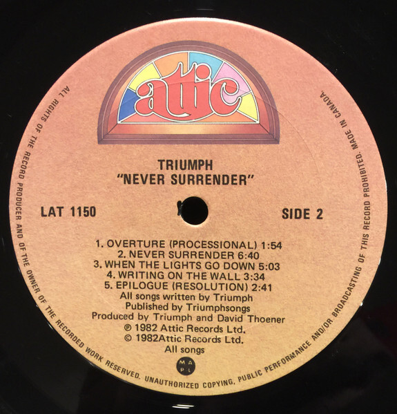 Never Surrender is the sixth studio album by Canadian hard rock band Triumph, released in 1982. The album reached #26 on the Billboard Albums chart assisted by the singles "All the Way", "A World of Fantasy" and "Never Surrender" which hit #2, #3 and #23, respectively, on the Billboard's Mainstream Top Rock Tracks chart in 1983. "All the Way" (the third of the three tracks to chart) was Triumph's highest charting song on the Top Rock Tracks chart, but did not sustain that level of popularity with Triumph fans as the song is not included on their 1985 live album Stages, the later Classics (a Greatest Hits album) or 2005's Livin' for the Weekend: The Anthology album.
