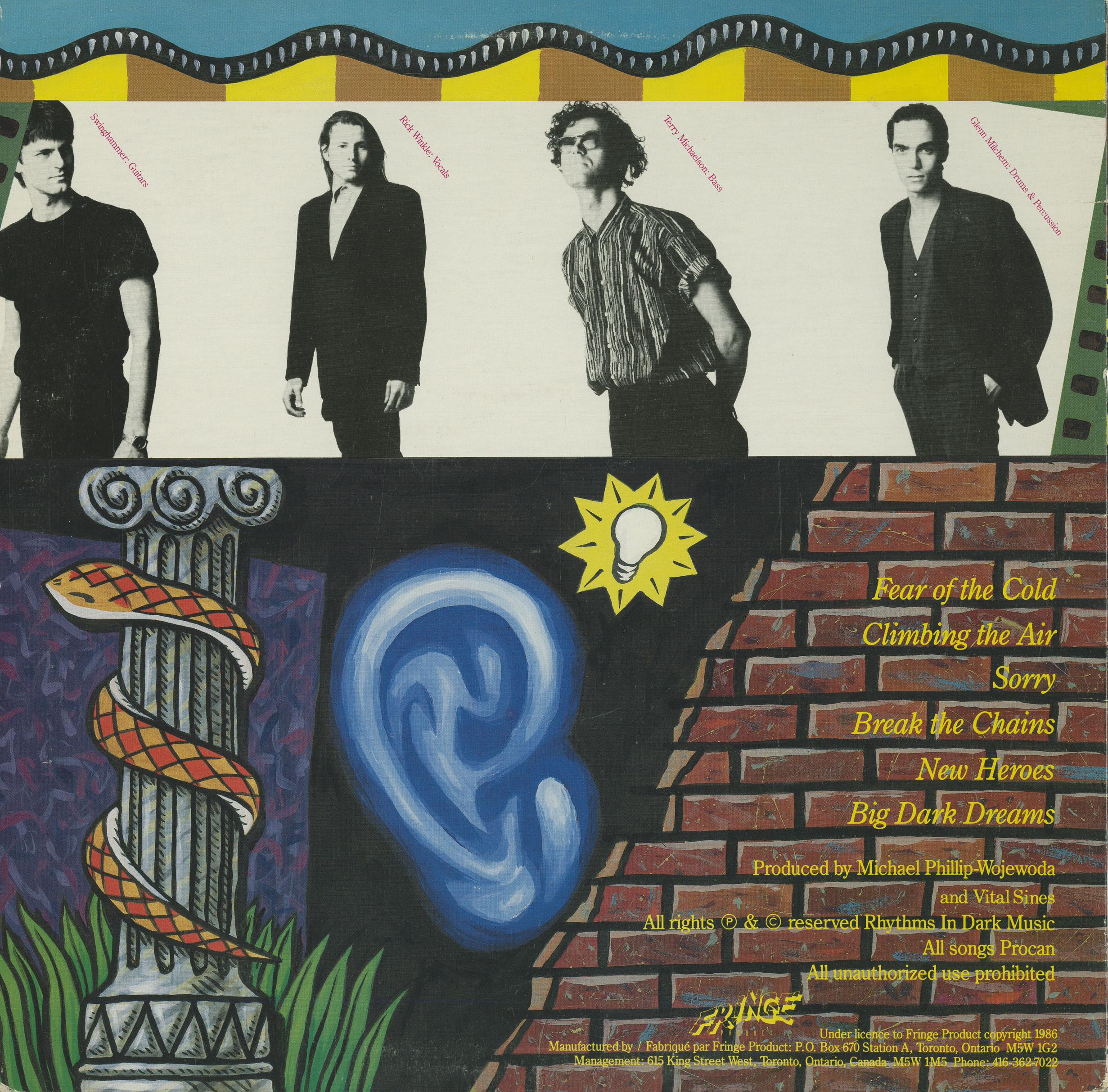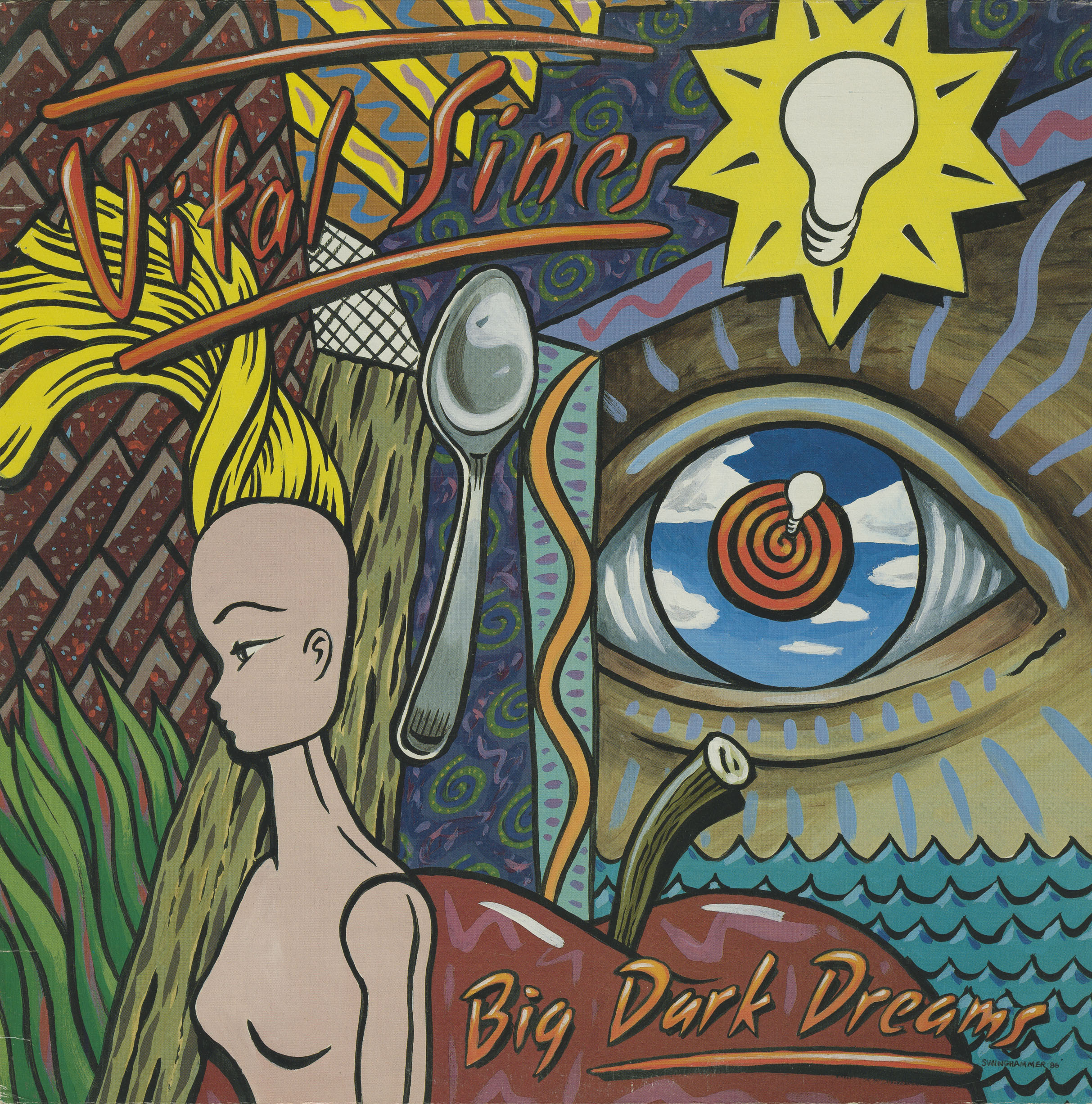 The result was Big Dark Dreams, a six-song 12-inch release issued in 1986 on Fringe Product as FPE 3029. If Collage was the breakthrough, Big Dark Dreams was the band’s most ambitious and fully produced release. Produced by Michael Phillip Wojewoda and the band, and recorded at Grant Avenue Studio with additional work at The Sound Kitchen, the record expanded Vital Sines’ palette without abandoning their identity. The core credited lineup was Rick Winkle (vocals), Kurt Swinghammer (guitar), Terry Michaelson (bass), and Glenn Milchem (drums, percussion), with a strong supporting cast that included Gordie Wilson on additional guitars, James Gray on keyboards, Holly Cole and Tamara Silvera on backing vocals, and The Fulton Ave. Boys Choir.