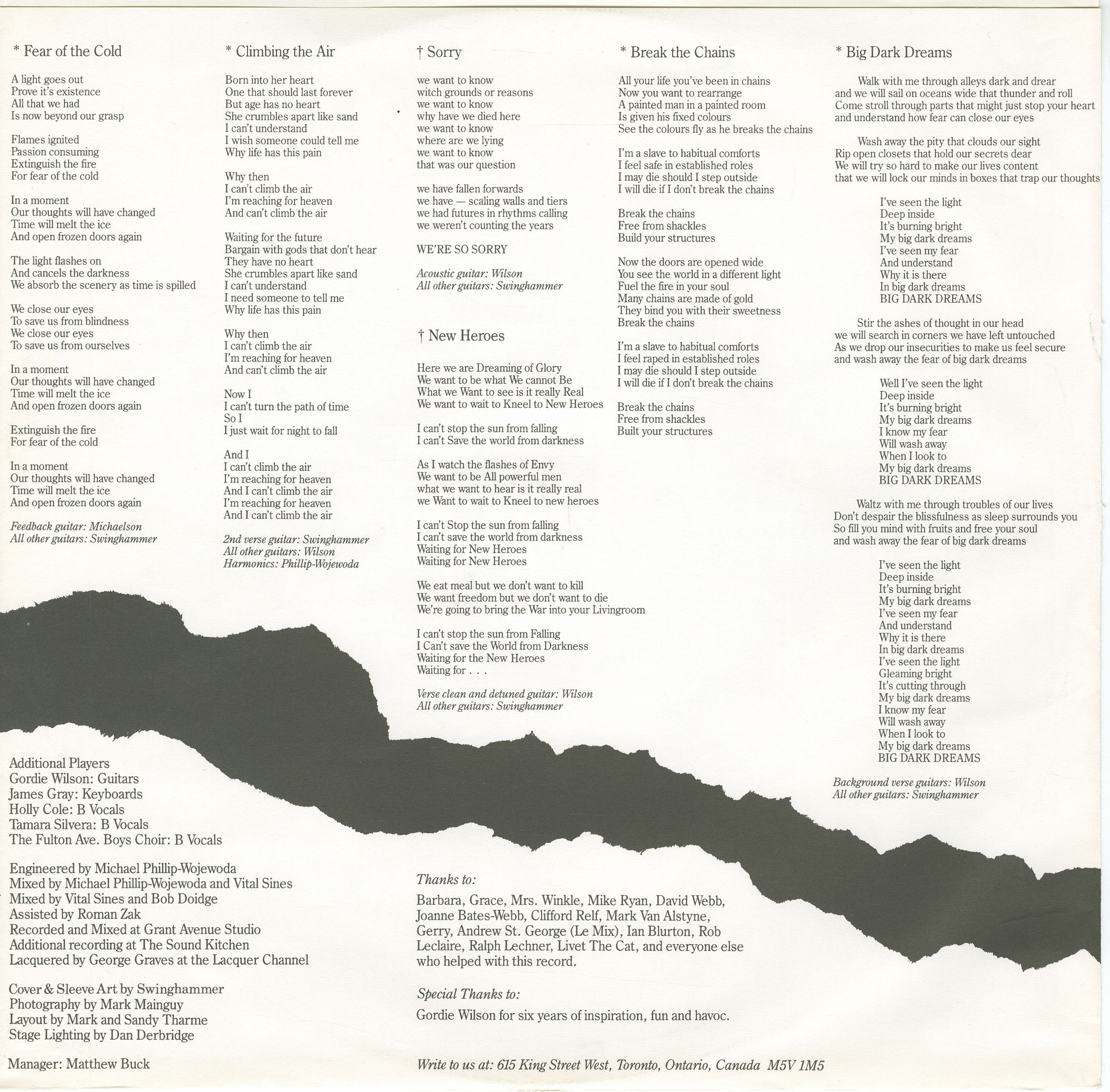 Its songs — ‘Fear Of The Cold,’ ‘Climbing The Air,’ ‘Sorry,’ ‘Break The Chains,’ ‘New Heroes,’ and ‘Big Dark Dreams’ — reveal a band pushing deeper into atmosphere and arrangement. The sleeve itself is unusually revealing, crediting specific guitar assignments and sonic details from track to track, underscoring how carefully the record was assembled. Wilson remained deeply embedded in the material despite his altered status, with key guitar parts still attributed to him across multiple songs, while Swinghammer’s presence helped shape the finished record’s sharper visual and musical identity. The cover art was by Kurt Swinghammer, linking the release not just to his playing but to his wider artistic sensibility.