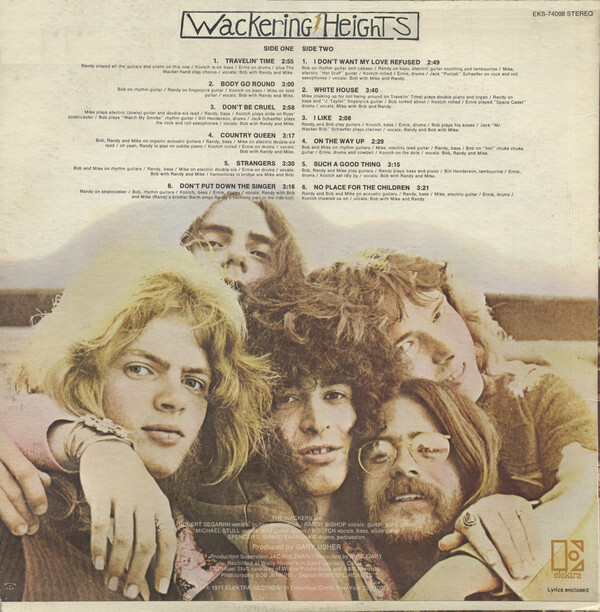 "It was the most fun I ever had in a band, because it wasn't work. That was the excitement of the Wackers. It was like rolling off a log. You couldn't not enjoy it. Everybody knew where to go for their harmony part. I love Wackering Heights, because you can sort of hear the joy of it." As to what made their vocal harmonies special, he adds, "If you listen to Beatle records, most of their harmony is two-part. I grew up learning how to sing by singing the unsung third part in Everly Brothers records. So when the Beatles came out, I would sing the third part that wasn't there on those records. Like 'If I Fell'; I'm the only person on earth who can sing a successful third part to 'If I Fell,' especially the really difficult part in the bridge. I just figured it out by singing along with it. So basically the Wackers is harmony-heavy because we always included the part that nobody ever did. When there were great things like 'Nowhere Man' where they did do the three parts, we built on that. Kootch also sang, so occasionally we would use four parts on tunes." The Beatles weren't the only influences that could be heard in the harmonies; as Segarini told Gary Sperrazza and Lester Bangs for their Wackers article in Shakin' St. Gazette, "Jac Holzman once told me we sounded like a cross between the Grateful Dead and Crosby, Stills, Nash & Young."