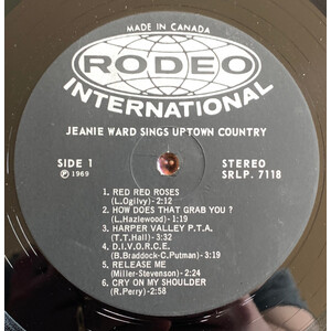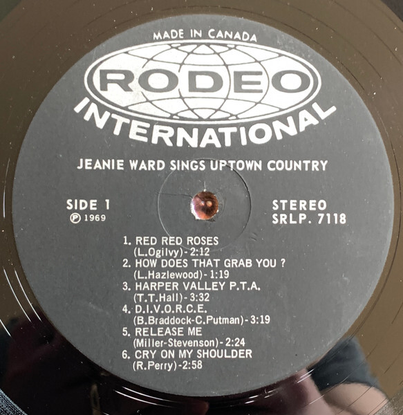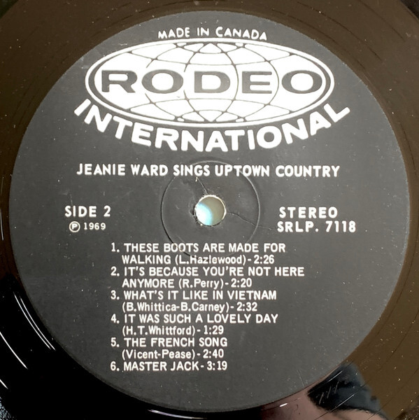 Jeanie's voice is strong throughout, and I really enjoyed listening to the album (which, by the way, was autographed on the back by Ms. Ward and Hal Lone Pine in 1970). She covers some familiar pop territory, like a fun countrified version of the Nancy Sinatra megahit These Boots. My favourite song on the album is the cheeky "Harper Valley PTA" which is about a single mother getting some revenge on the folks on her daughter's school PTA.