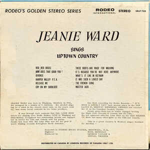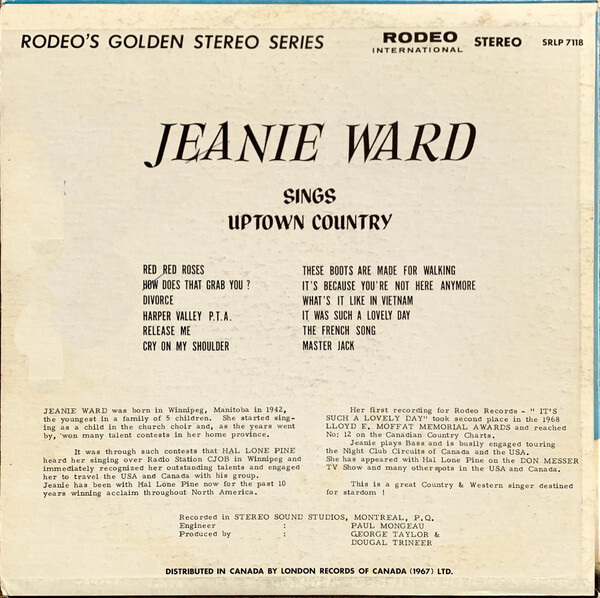 "Jeanie Ward was born in Winnipeg, Manitoba in 1942, the youngest in a family of 5 children. She started singing as a child in the church choir and, as the years went by, won many talent contests in her home province.