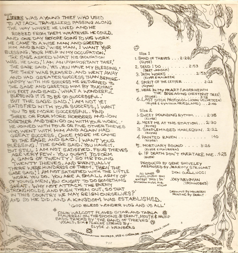 The album was a mixture of pastoral folk/rock, tripped out psychedelia, and orchestrated strings and horns in the style of the Beatlesà "Sgt. Pepper's" album. What really blew me away was the singing. Elyse's voice manages to be very pretty and melodic, while also sounding very desperate and ragged, quivering and shaking through songs brimming with a sense of impending doom. Scary and magical stuff. Highlights include "John Velveteen", an incredibly moving and tragic narrative about a knight watching his lovely maiden die (this is the song portrayed by the cover art), a heart wrenching cover of Bert Jansch's "Deed I Do", and the acid drenched, sound effects laden freak out of "Iron Works".