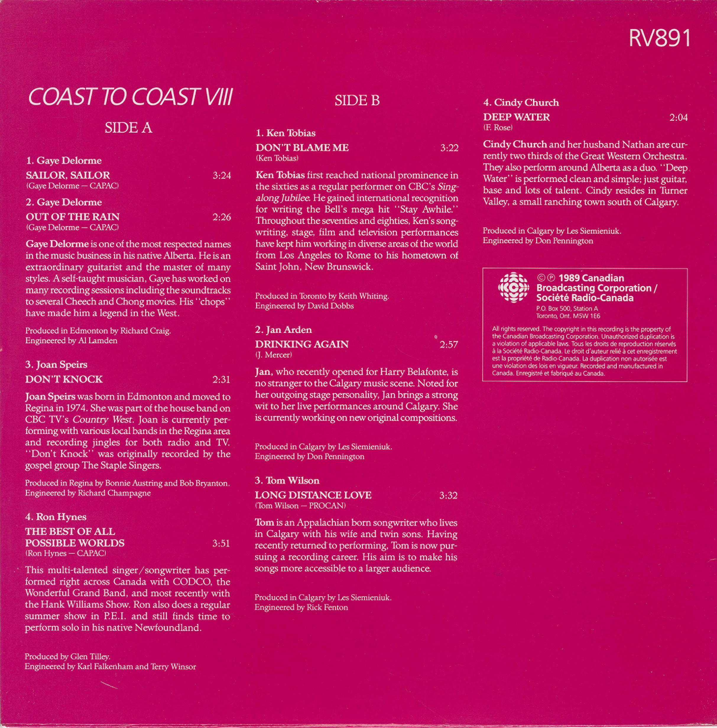 Coast to Coast VIII included many early and first original recordings by Canadian artists including first recordings by Gaye Delorme, Jann Arden, and Cindy Church as well as tracks by Ron Hynes, Ken Tobias Tom Wilson, and Joan Speirs that are unique to this album.