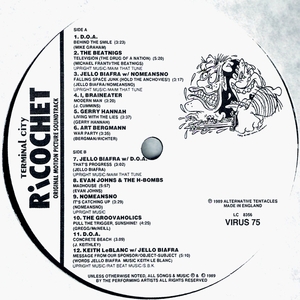 Starring Jello Biafra (of the Dead Kennedys), Terminal City Ricochet is a dystopian comedy critical of television and its collusion with government and consumerism. Terminal City Ricochet is well known in cult film circles, but it has only been shown at film festivals, and a few times on pay-TV. The DVD combo, (containing both the DVD of the film and a CD of the movie soundtrack) has been made available through the Alternative Tentacles Website. It was released in stores in October 2010.