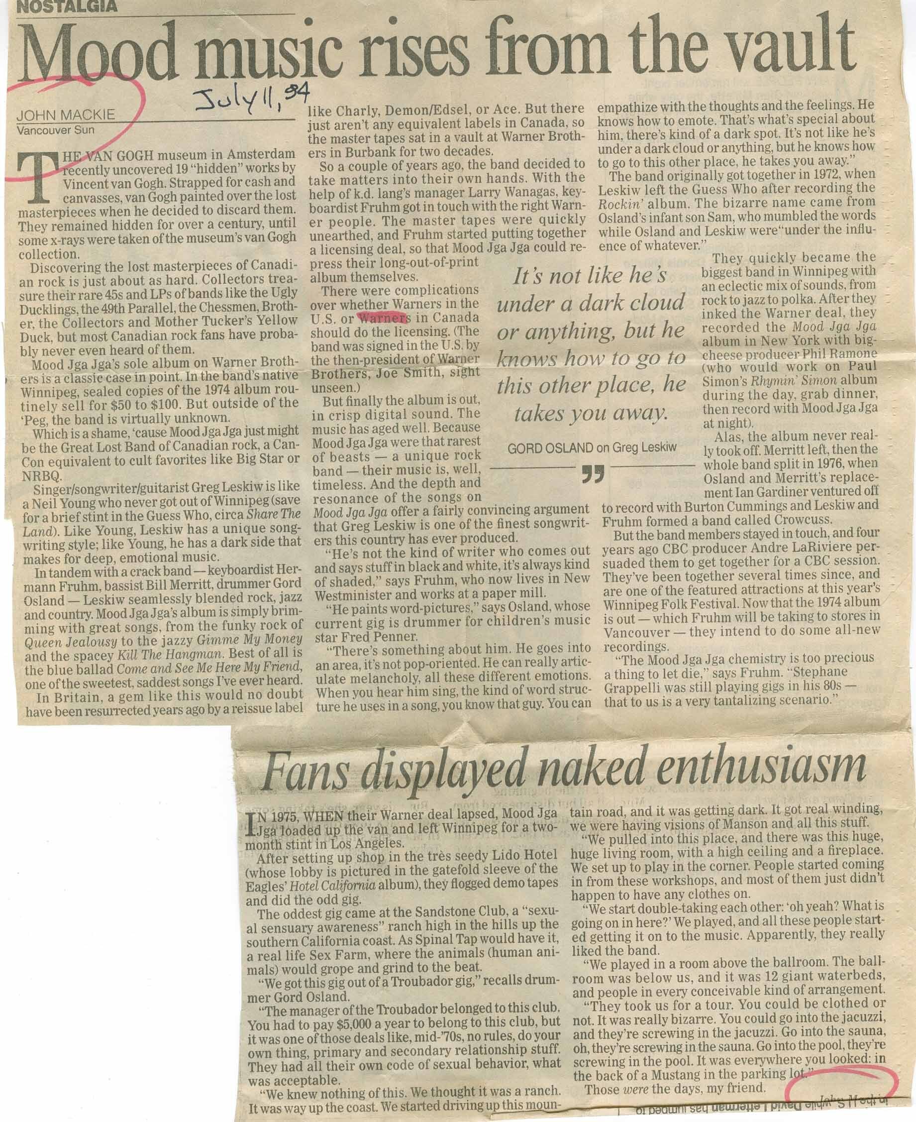 Mood Jga Jga features the fine writing of Greg Leskiw and is the finest funky jazz country blues rock album ever released in the province of Manitoba. The music is timeless. It could have been released last year, or 10 years ago, or 20 years ago, and you wouldn't know it.