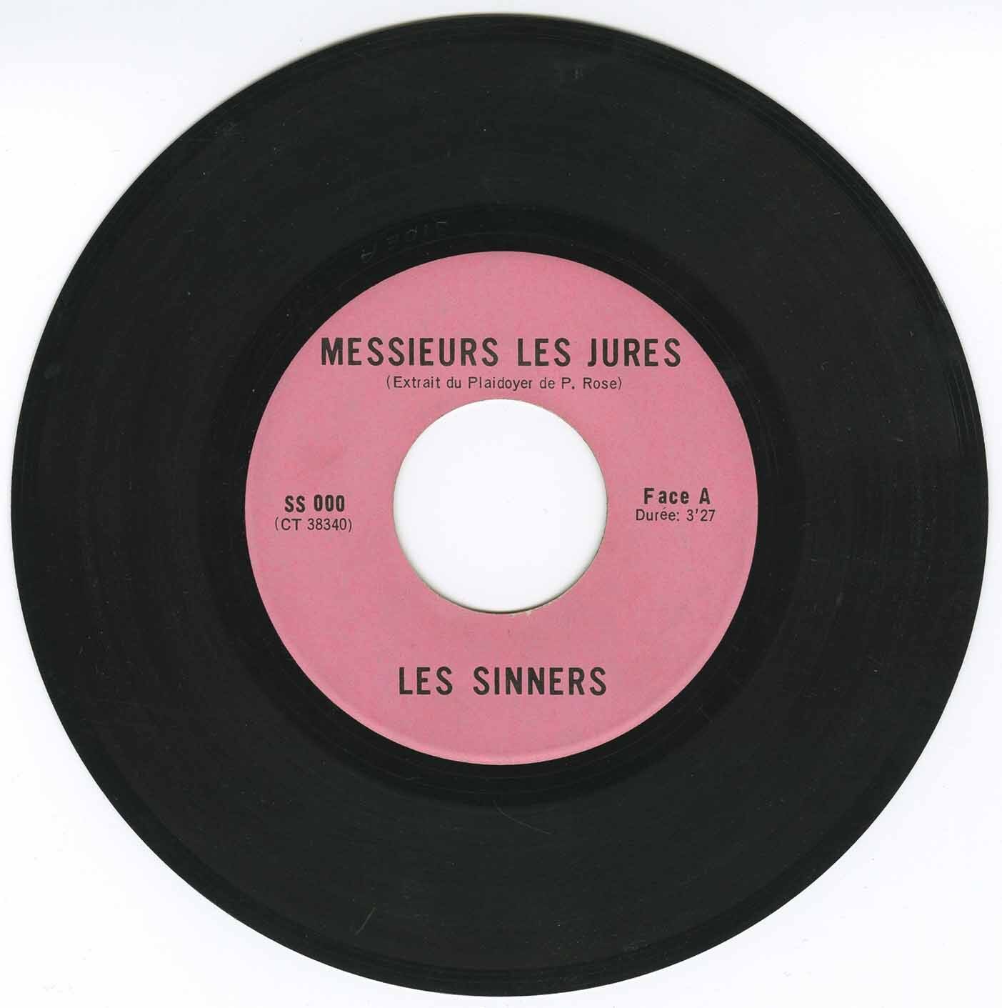 A rare, privately pressed 45 by Montréal’s Les Sinners—one of the most politically charged and historically significant recordings to emerge from Québec’s turbulent early-1970s counterculture. Side A, “Messieurs les jurés,” presents an almost verbatim transcription of the courtroom plea delivered by Paul Rose, leader of the Chénier cell of the Front de libération du Québec (FLQ), who in 1970 was convicted of the kidnapping and murder of Québec cabinet minister Pierre Laporte during the October Crisis. The text was reportedly collected from Rose in prison by Louis Parizeau, drummer and founding member of Les Sinners, and then set to music by the band—a striking collision of rock and radical politics at the height of Québec’s identity struggle.
