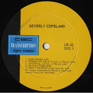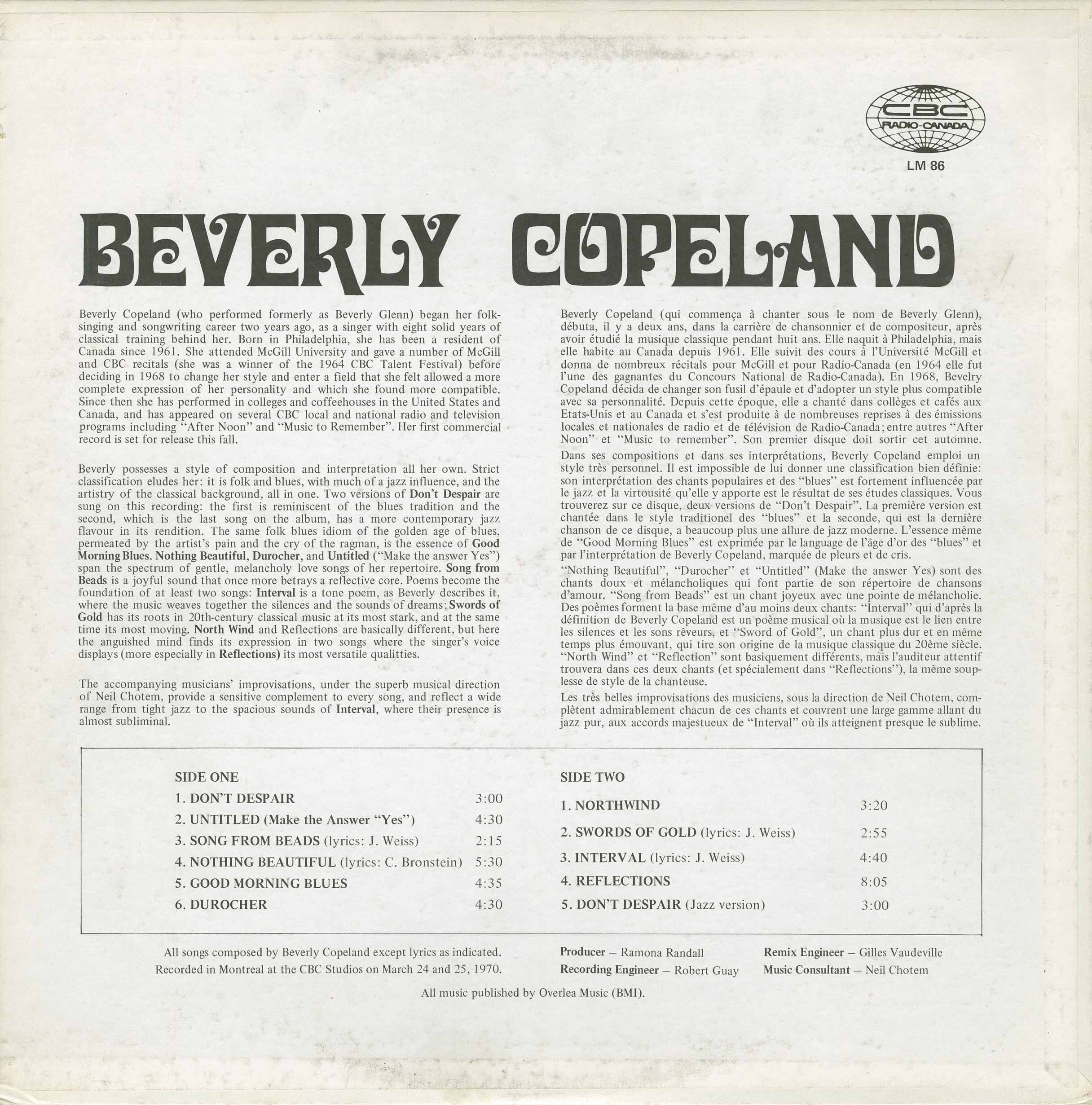Beverly possesses a style of composition and interpretation all her own. Strict classification eludes her: it is folk and blues, with much of a jazz influence, and the artistry of the classical background, all in one. Two versions of “Don’t Despair” are sung on this recording: the first is reminiscent of the blues tradition and the second, which is the last song on the album, has a more contemporary jazz flavour in its rendition. The same folk blues idiom of the golden age of blues, permeated by the artist’s pain and the cry of the ragman, is the essence of “Good Morning Blues, Nothing Beautiful, Durocher, and Untitled (“Make the answer Yes”) span the spectrum of gentle, melancholy love songs of her repertoire. “Song From Beads” is a joyful sound that once more betrays a reflective core. Poems become the foundation of at least two songs: “Interval” is a tone poem, as Beverly describes it, where the music weaves together the silences and the sounds of dreams; “Swords of Gold” has its roots in 20th-century classical music at its most stark, and at the same time its most moving. “North Wind” and “Reflections” are basically different, but here the anguished mind finds its expression in two songs where the singer’s voice displays (more especially in “Reflections”) its most versatile qualities.