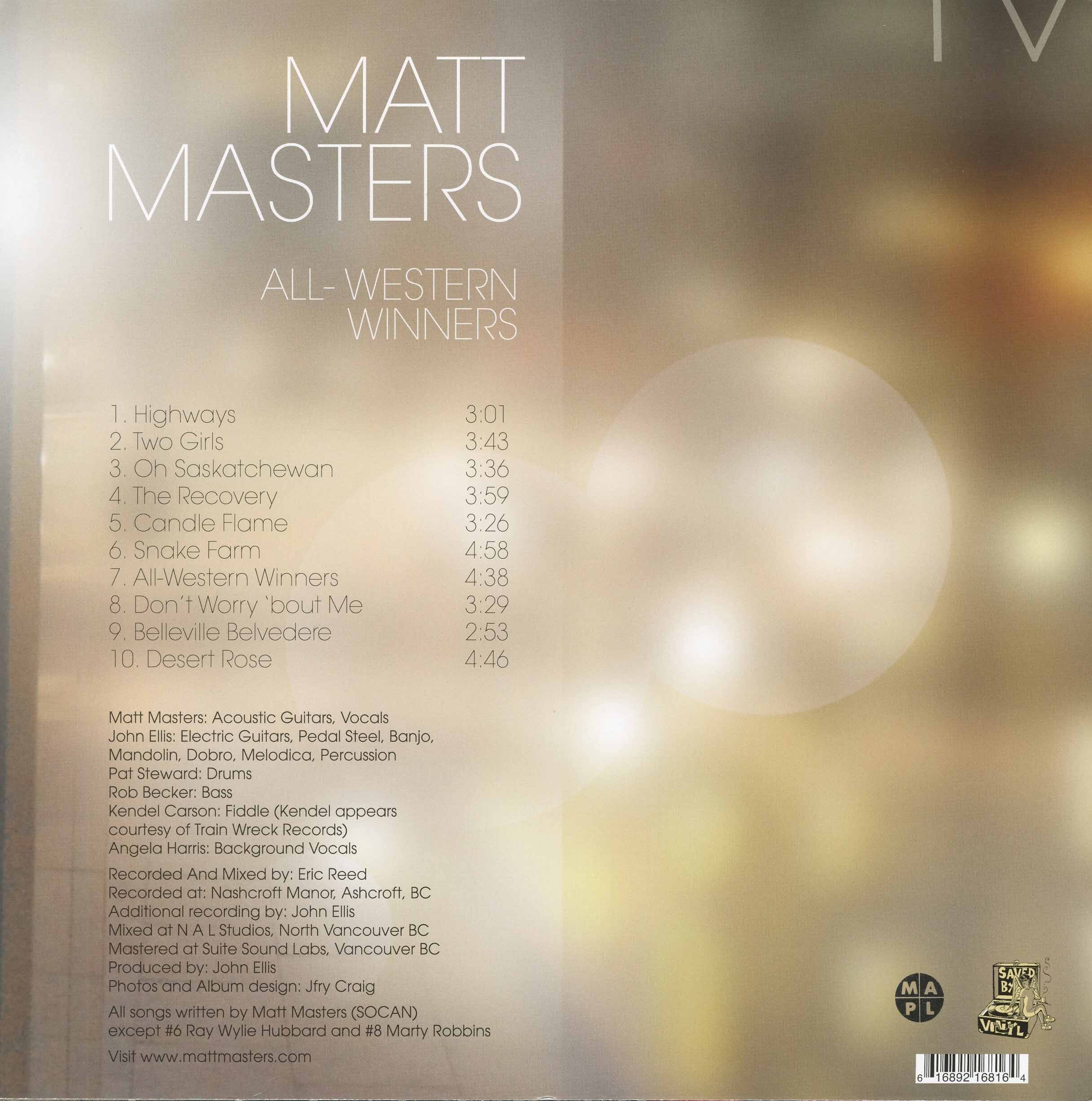 “I did the recordings for the new album All-Western Winners (Saved by Vinyl) with John Ellis last October,” he says. “John’s worked as a producer in the country music industry for years and but he also appreciates that rock dynamic. Johnny saw me rock out in Carstairs and said ‘I like this.’ So we flew off to Kamloops and recorded for five days. The songs are a very diverse mix — ‘Oh, Saskatchewan’ is a tune I wrote 10 years ago and it came out on my first ever release.... People close to me have commented that it doesn’t sound like Matt Masters at all; they say it sounds more like Danzig, or something.”
