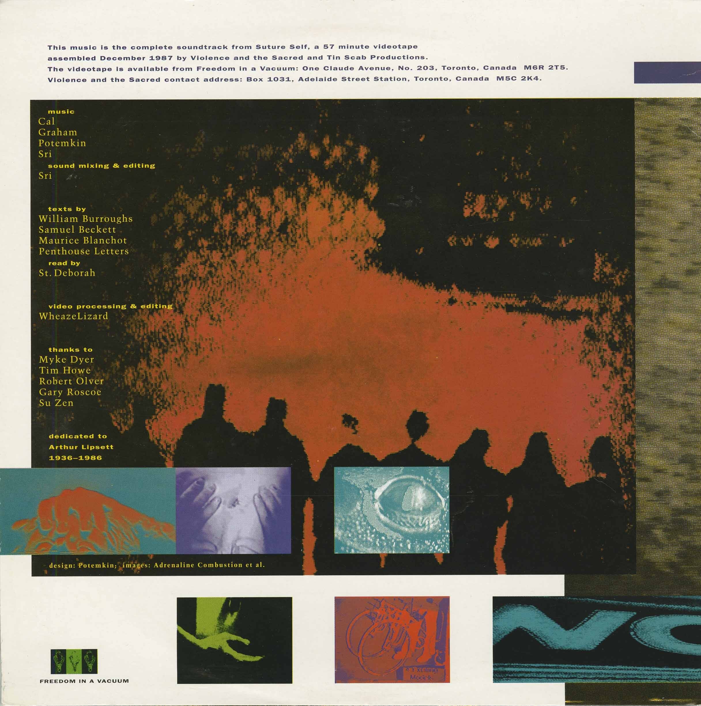 This music is the complete soundtrack from Suture Self, a 57 minute video assembled December 1987 by Violence and the Sacred and Tin Scab Productions. Texts by William Burroughs, Samuel Beckett, Maurice Blanchot, Penthouse letters, read by St. Deborah.