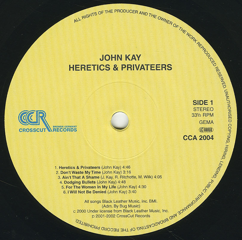 In 2000, Crosscut Records in Germany released John Kay's solo album "Heretics & Privateers" on 180 gram pure virgin vinyl. John Kay obtained the last 16 copies on the planet and has autographed them! This collectible, when sold out, will never be available again.