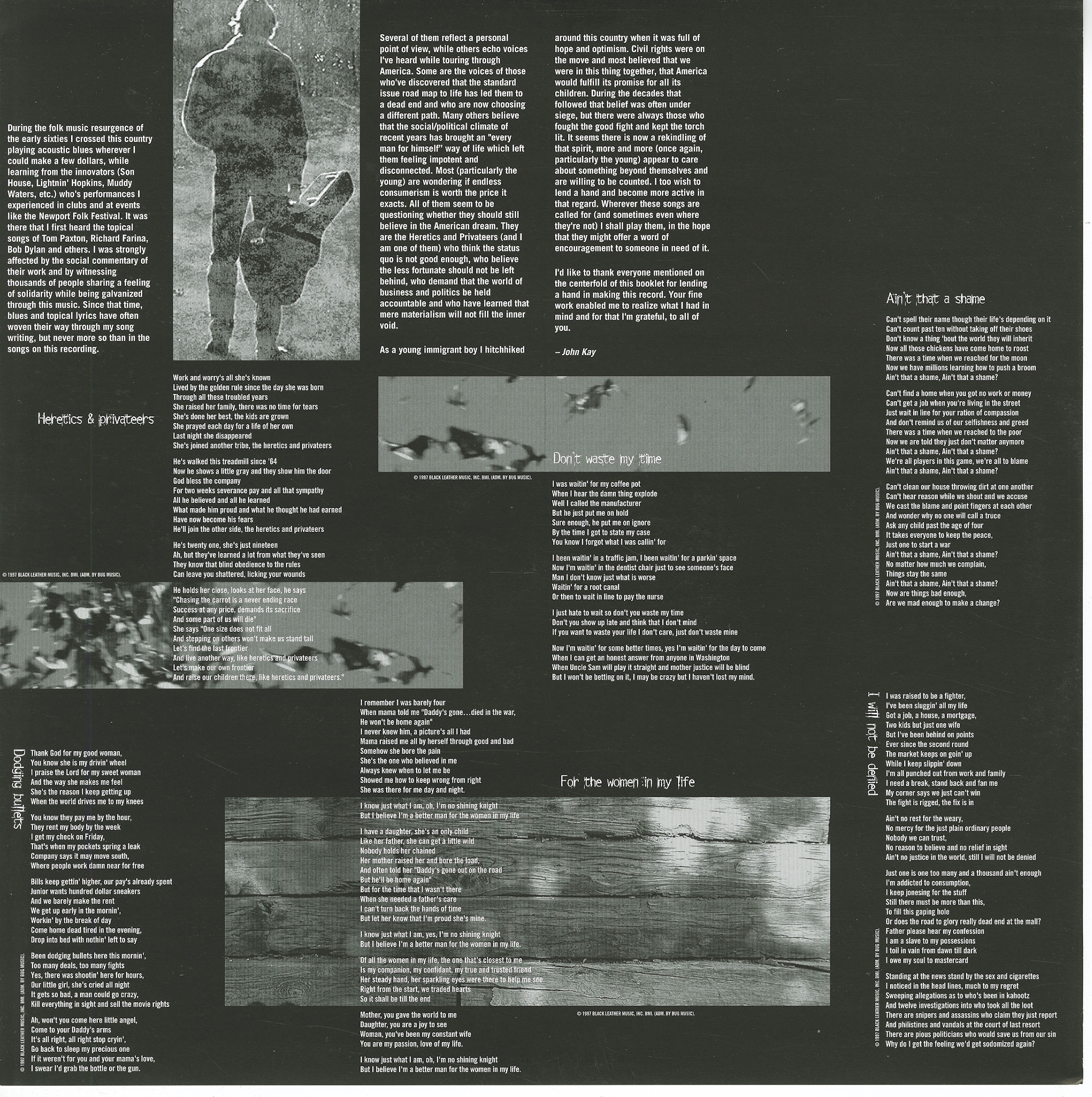 Heretics and Privateers offers a gritty view of contemporary life, surveying the human toll of institutional callousness with unflinching clarity. Kay, whose evocative growl is one of rock's most distinctive voices, offers some of the most heartfelt performances of his career on such stark numbers as "Ain't That A Shame" and "The Ice Age," which movingly lament the erosion of everyday compassion. Elsewhere, "Dodging Bullets" and "I Will Not Be Denied" examine the plight of ordinary people doing their best to survive within a system that seems stacked against them, while "Endless Commercial" takes aim at the media manipulation the drives consumer culture, and "Sleep with One Eye Open" delineates the inevitable violent results of societal inequity. Despite the songs' unsparing insights, their darker implications are frequently balanced by biting humor, as exemplified by "Don't Waste My Time" and "She's Got the Goods."