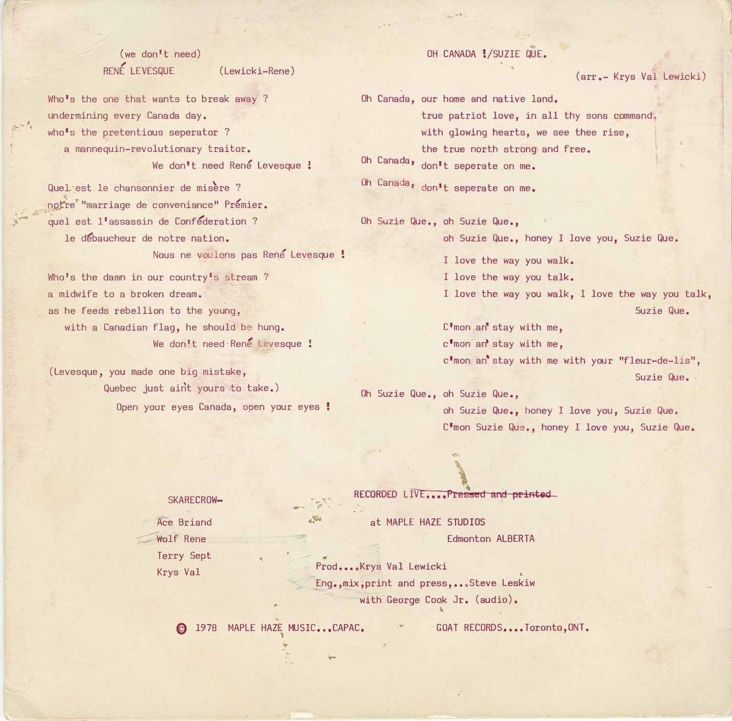 Krys wrote the Rene Levesque song as a tribute to Canada. “It’s such a great honour to play in a band and have the opportunity to travel all over this great Country”. They played everywhere, from one end of the country to the other, from Newfoundland to B.C., Whitehorse, Yellowknife and all parts along the way. For Krys, the potential break-up of the Country was gut-wrenching. He goes on to say, “Rene Levesque was a traitor, and as a Canadian citizen, he dishonoured his duty of allegiance to Canada”. When he wrote the song, he tried to be as respectful as possible. Wolf Rene, the band’s lead guitarist, was French Canadian and handled the French verse. They played the song as part of their set, no matter where they were including places like Longueuil, La Sarre and Montreal. The audience would often give the fist-pump when they played the song, especially the lyrics “with a Canadian flag, he should be hung”. “This is what the RCMP had a problem with” along with the use of the Canadian flag on the cover of the picture sleeve. Goat Records GR 4445 “(We Don’t Need) Rene Levesque” b/w “Oh Canada-Susie Que.” … (As listed by) Skarecrow