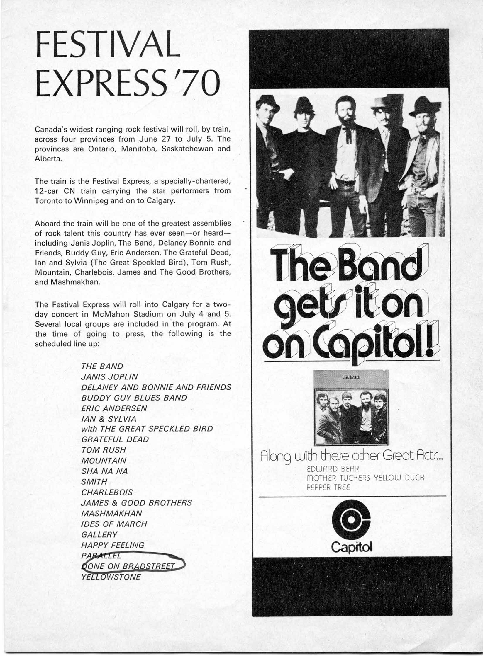 They were one of the acts playing in Calgary's version of Festival Express in 1970, along with other acts including The Band, Janis Joplin, Buddy Guy, Grateful Dead, Tom Rush, Mountain, Robert Charlebois, James & The Good Brothers, Mashmakhan, Ides of March as well as fellow-Calgarians Happy Feeling and Ian & Sylvia Tyson.