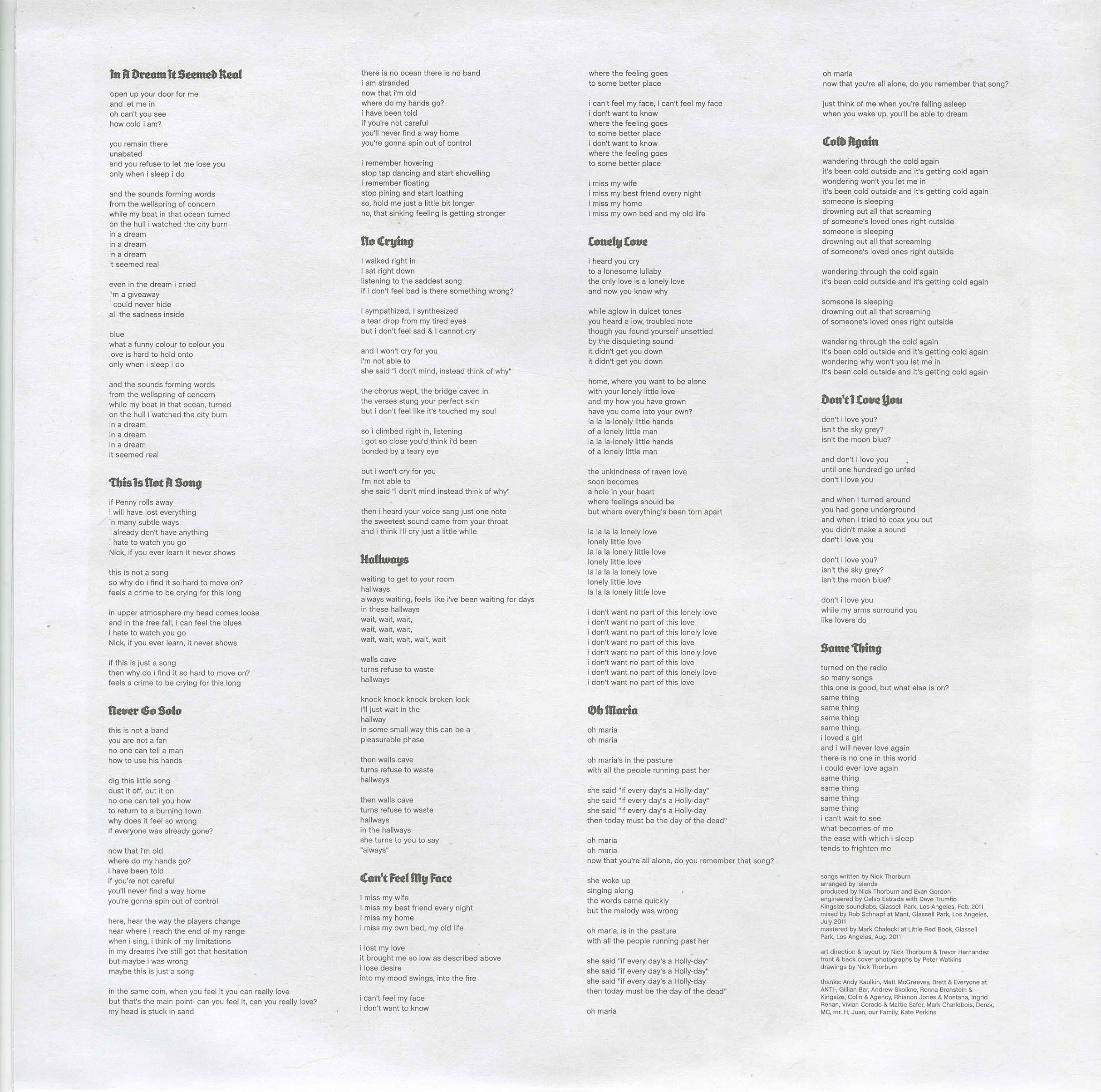 The new album offers all the shimmering sonic textures and irresistible melodies that have come to define Islands enduring appeal, but there is a deeply personal cathartic undercurrent to the songs. “The sound is really my interpretation of soul music,” Thorburn offers. “I mean, I’m a white kid from Canada so it’s gonna be very warped. But that’s where my head was at, that particular way of dealing with themes of pain and heartbreak.”