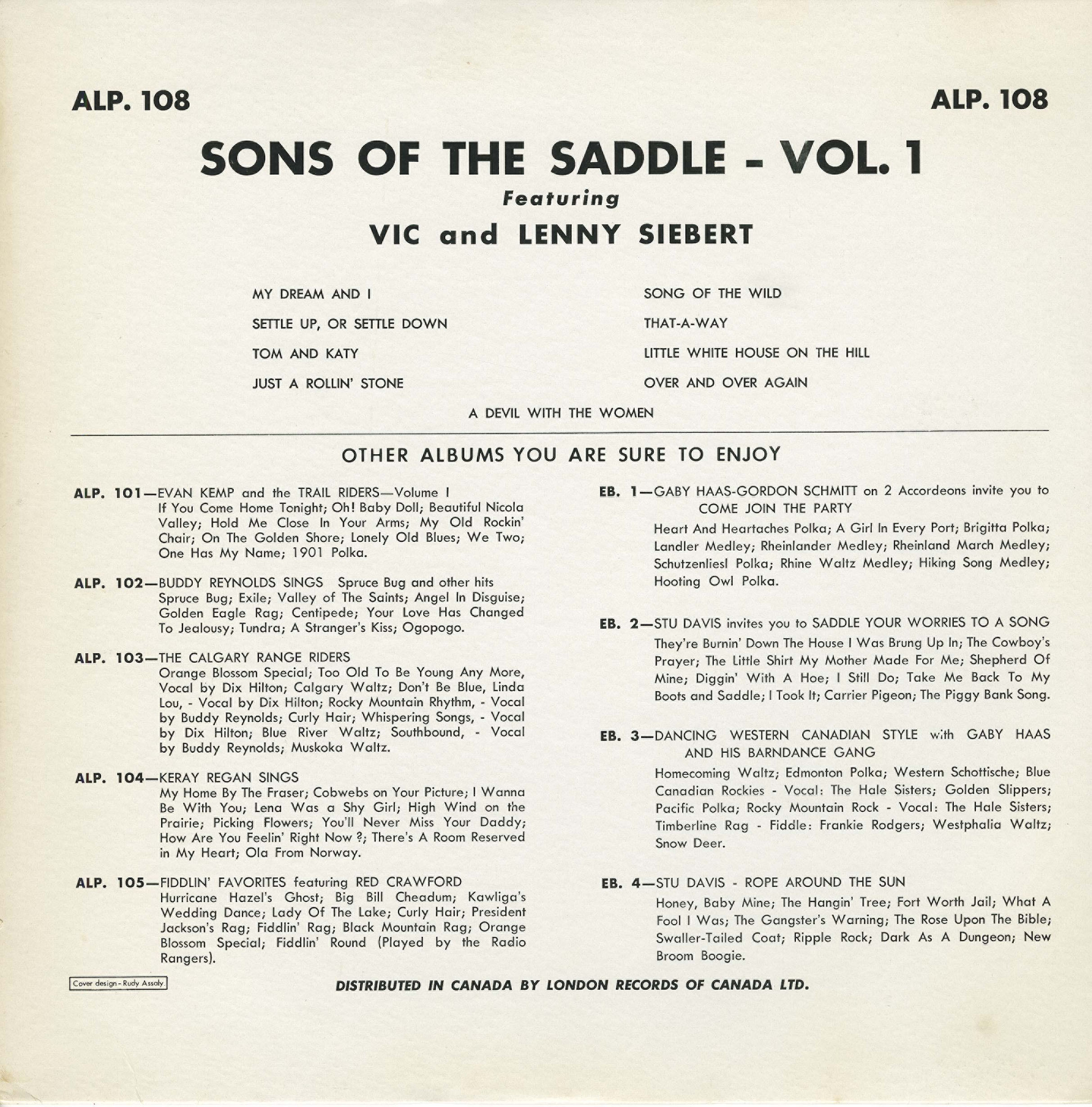 The group’s recorded output consists of a small but significant run of Canadian LPs issued in 1959 and the early 1960s. Two albums were released on Aragon Records—Sons of the Saddle Vol. 1 Featuring Vic and Lenny Siebert (ALP 108) and Sons of the Saddle Vol. 2 Featuring Gene Siebert (ALP 113)—documenting different Siebert-led configurations of the band. A later self-titled LP on Canatal Records (CTLP 4003) presented a repertoire drawn largely from contemporary country standards alongside original material associated with the group.