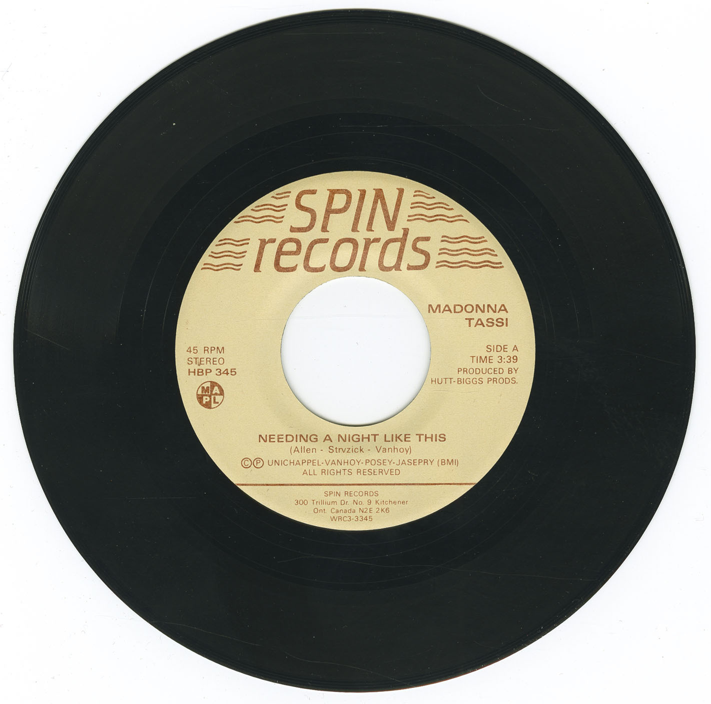To display the strength of Madonna's voice in a range of styles, Spin Records has recorded two songs. The A side, " Needing A Night Like This ", co-written by Deborah Allen ( Baby I Lied ), is a smooth, accessible composition that would be at home on either country/crossover or adult contemporary playlists. "No Chains", the flip side, is a high energy, pop/dance piece written by Steve Hogg (Ian Thomas Band, Ronnie Hawkins Band). The A side is two parts MAPL, the B side four parts.