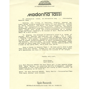 Madonna, now living in Hamilton, Ontario, started her music career singing supporting vocals for such Canadian artists as Marie Bottrell, Lea Bach, the Mersey Brothers and Dallas Harms. Her background in touring groups, local and nationally syndicated television programs, theatre productions and extensive radio / jingle work gives her a solid grounding as a dynamic singer/performer. Madonna’s 45 release on Spin Records marks her debut as a solo artist.