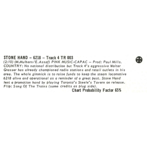 The locomotive, the last active steamer on CN, was a subject of interest to Assaf. His hotel, being directly across the street from the CN Tower in London, contained a number of oil paintings of famous Canadian steam locomotives, as well as a number of rail artifacts prominently displayed about the wall s o f the building. Mr. Assaf told Mulhern the story of the locomotive and suggested they collaborate on a song about the engine. A number of tunes and lyric ideas changed hands between the two over the next three months, and when the first draft of the song was completed, it was recorded at Track 4's studios, operated by Walter Crasser. Crasser subsequently became Mike' s manager and diehard promoter of the song. The initial recording of the song prompted the writers to initiate some changes in the structure of the song, and it was then completed in its present melodic form two weeks later. The song was again recorded at Track 4. Shortly after the take was completed, Mulhern teamed up with singer-guitarist Don Mathers to form what is now known as Stone Hand. Together they began performing and promoting the song "6218" along with Assaf and Crasser. Their promotion efforts have taken Stone Hand on the UCRS winter excursion of January 24, 1971, from Toronto to Orillia, where a film crew from the CBC television show "This Land" filmed the group and their song. The song and also "The Song of the Train " were broadcast on the "This Land" television show nationally on February 24, 1971 (and again on July 14). The song has also been performed on CFPL-TV in London, and article s on the song and the train have been published in newspapers throughout the country. The subject of the Stone Hand's song “6218” needs very little introduction to railfans. Although the recording may not help to keep the engine in operation, it is designed to preserve the memory of the locomotive, and in some way preserve the memory of steam. The flipside of the record is a beautiful treatment of the song that started it all "The Song of the Train".