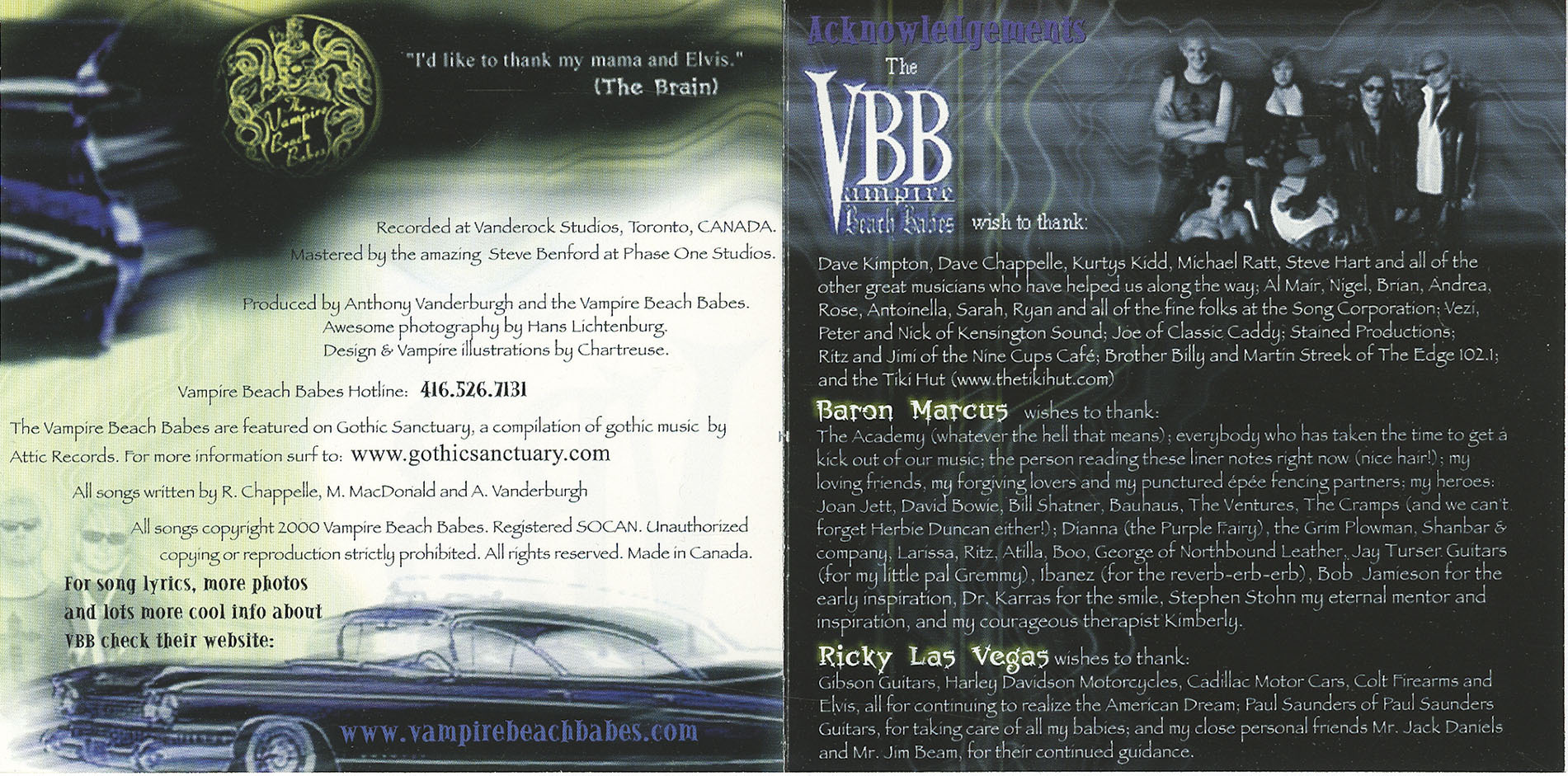 At least some of this hysteria can be blamed on the inclusion of the Vampire Beach Babes underground hit 'Gothic Surf-a-rama' on the premier Gothic music compilation 'Gothic Sanctuary'. Such recognition no doubt exacerbated the spread of the Vampire Beach Babes madness. Their December 1st 2000 performance at the Opera House in Toronto was voted as second best performance of the year 2000 (second to VnV Nation and tied with Nine Inch Nails) by Gothic online community Dark Entries (www.dark-entries.com), further accelerating the spread of this scourge. Cover page mention and feature of the Vampire Beach Babes in the widely celebrated horror magazine Rue Morgue did nothing to protect the general public from this menace. Spanking in New Years 2001 with a midnight performance to 500 wanton fetish scene aficionados, at The Big Bop in Toronto, Canada, brought this insanity to a fevered pitch. Then, Halloween 2001 at the Fetish Masquerade and of course the now infamous RCA Records showcase at CBGB's Gallery in New York City! At Toronto's Velvet Underground in February 2002, the TV camera crews of BRAVO and The New Music did their part in documenting this public menace. Furthermore, the president of TROMA Entertainment (the great Lloyd Kaufman) has hand picked the VBB to write the theme song for TROMA's next worldwide release feature film "Tales From The Crapper".