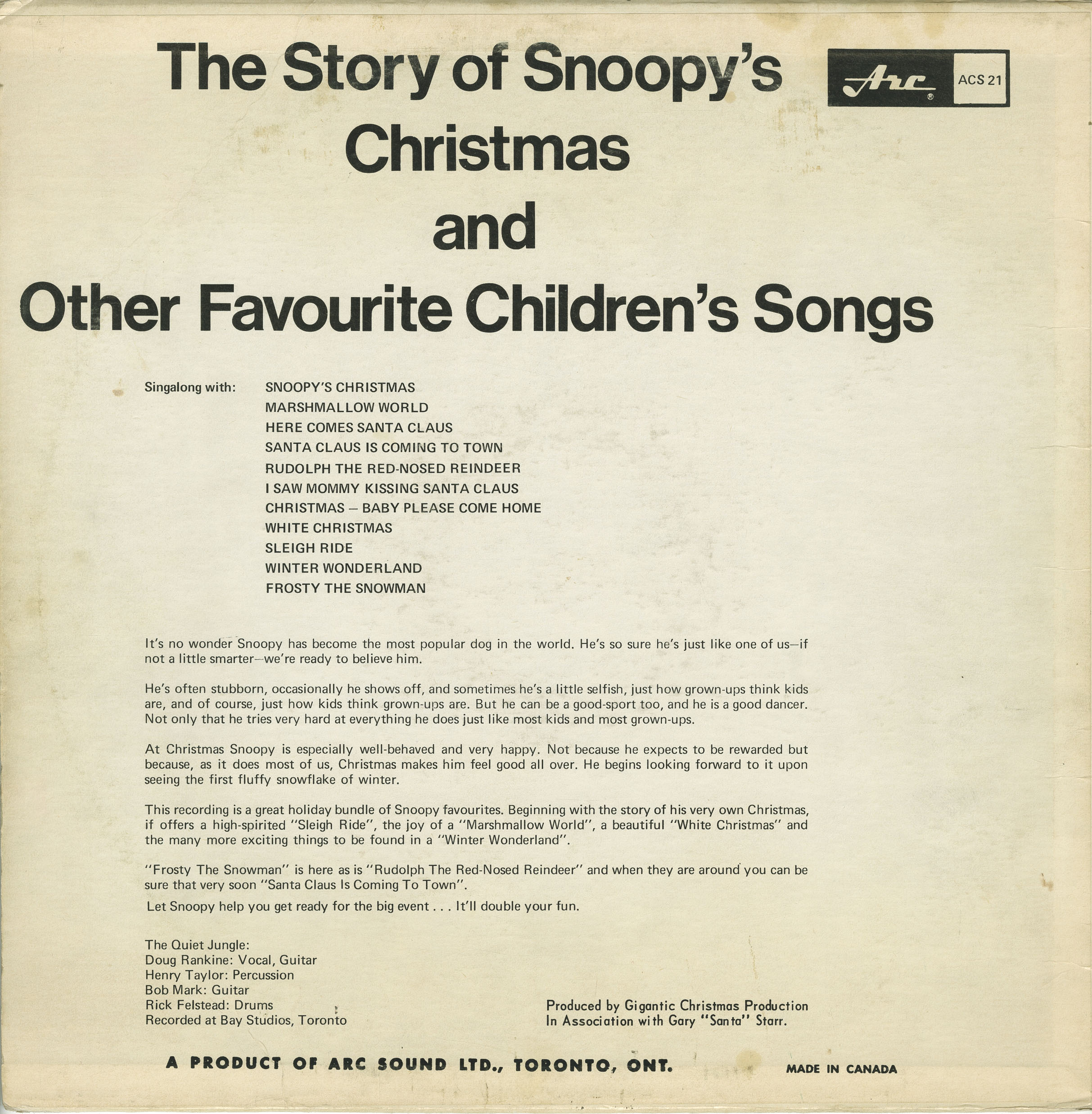 At the same time, the Quiet Jungle found steady work as session players for Toronto budget imprint Arc Sound. Under various guises they cut an entire LP of Monkees covers, A Little Bit Me, I’m A Believer, She Hangs Out plus 9 other Tail Hanger Favorites, and the Christmas album The Story Of Snoopy’s Christmas And Other Favourite Children’s Songs, the latter finally crediting the Quiet Jungle by name and listing Rankine, Mark, Felstead and Henry Taylor among the performers. They also appeared on the CTV teen show After Four, contributing the song Four In The Morning to the associated Yorkville compilation under the name Scarlet Ribbon. A Rolling Stones tribute LP on Arc, Let’s Spend The Night Together, famously used a photo of Rankine on the cover, although he later clarified that the Quiet Jungle did not play on that particular session.