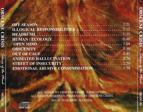 Montreal just seems to consistently ooze quality metal, and Obscene Crisis are further proof of this. Given more time in the studio and a bigger budget, they could very easily, in my opinion, become major contenders in metal realms. Already garnering acclaim in Europe, according to the band, this is one group to keep an eye and ear out for. Do yourself a favour and seek out a copy of this mini-album.